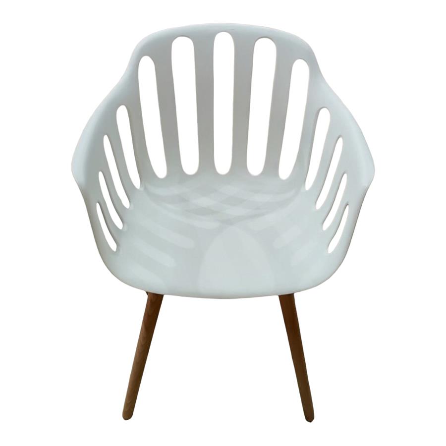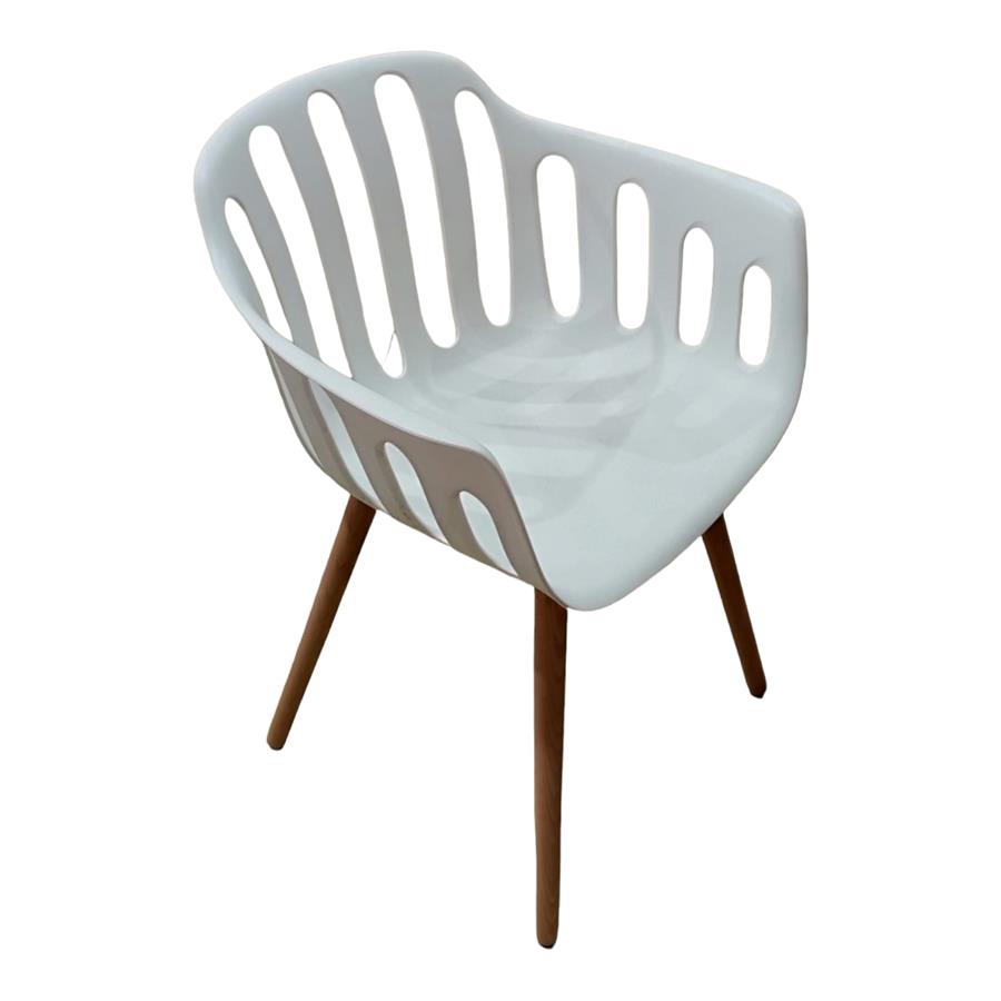 Esta silla de plástico blanco destaca por su diseño atrevido y contemporáneo. Su diseño calado, con un respaldo de listones, le da un aspecto único y fresco, ideal para cualquier ambiente. La estructura resistente contrasta con las patas de imitación madera natural, aportando calidez y versatilidad. Es una pieza funcional, perfecta para interiores o exteriores, que crea un ambiente de estilo moderno y personalidad.