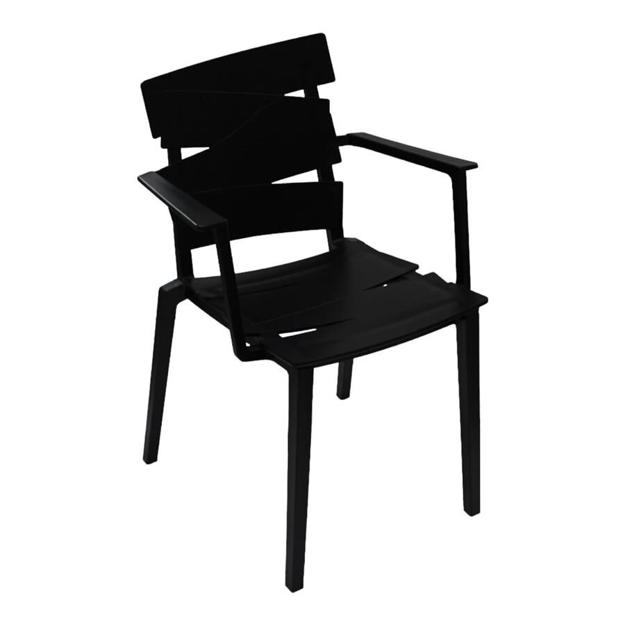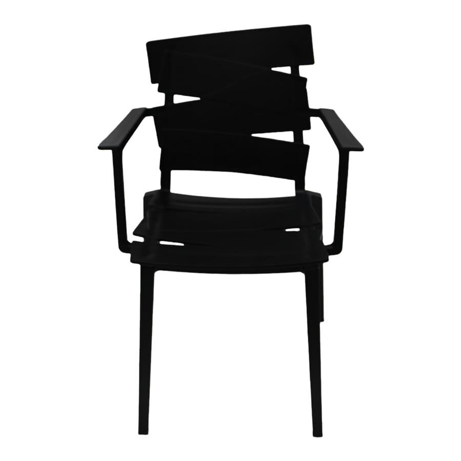 Esta silla negra es una pieza de diseño atrevido y vanguardista. Su respaldo de retablos inclinados le da una apariencia escultórica y única, transformándola de un simple asiento a un elemento de decoración destacado. Los descansabrazos integrados ofrecen mayor comodidad, y su fabricación en materiales de alta calidad la hacen resistente y perfecta para uso diario.