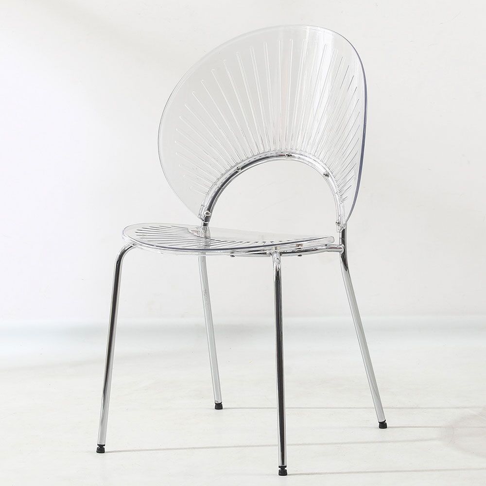 Esta silla de acrílico transparente es una pieza de diseño atrevido y sofisticado. Su elegante respaldo en forma de abanico le confiere un toque único y distintivo, mientras que las patas de metal plateadas le dan una base moderna y resistente. Perfecta para un comedor, un estudio o un evento especial, esta silla crea un ambiente vanguardista y con gran personalidad.