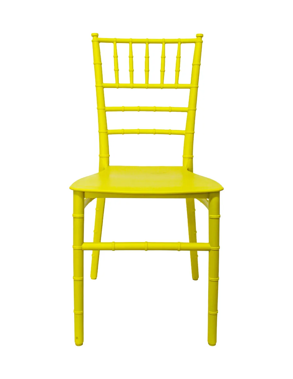 Una elegante silla Tifanny amarilla para decorar cualquier espacio. Su diseño es perfecto para añadir un toque de sofisticación a eventos, comedores o salas. Material: plástico.