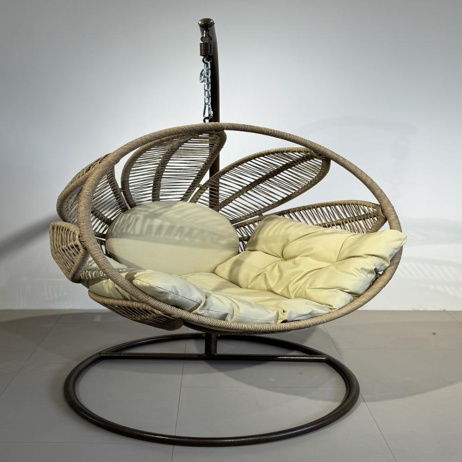 Sillon colgante de fibras plasticas con respaldo diseño flor y cojines con base de metal de 104x70x1