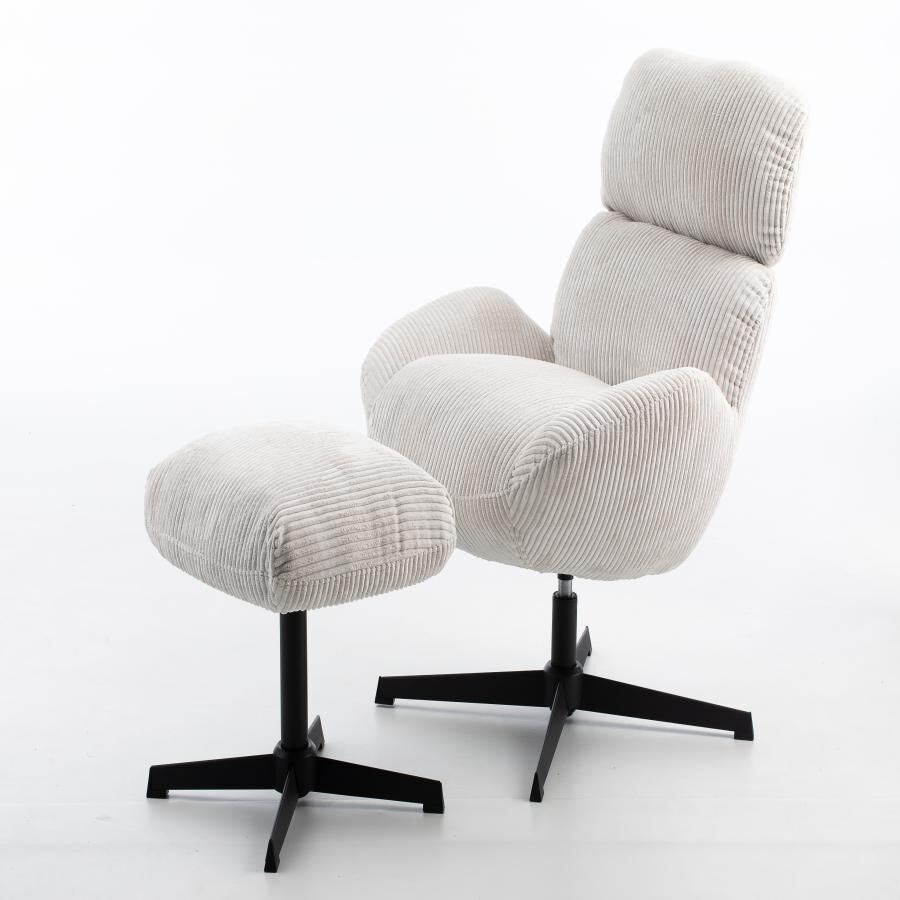 La máxima comodidad en un solo lugar. Este sillón giratorio con otomán de pana jaspe es la pieza perfecta para relajarte en tu hogar. Con sus medidas de 72x78x88cm, su diseño lleno de detalles evoca elegancia y confort.