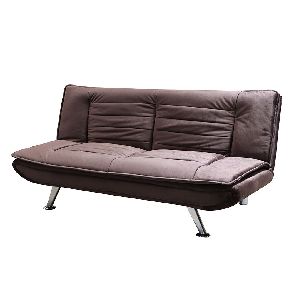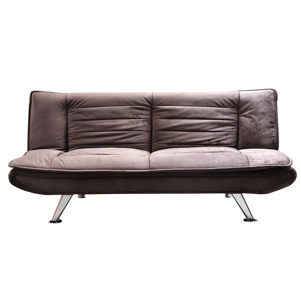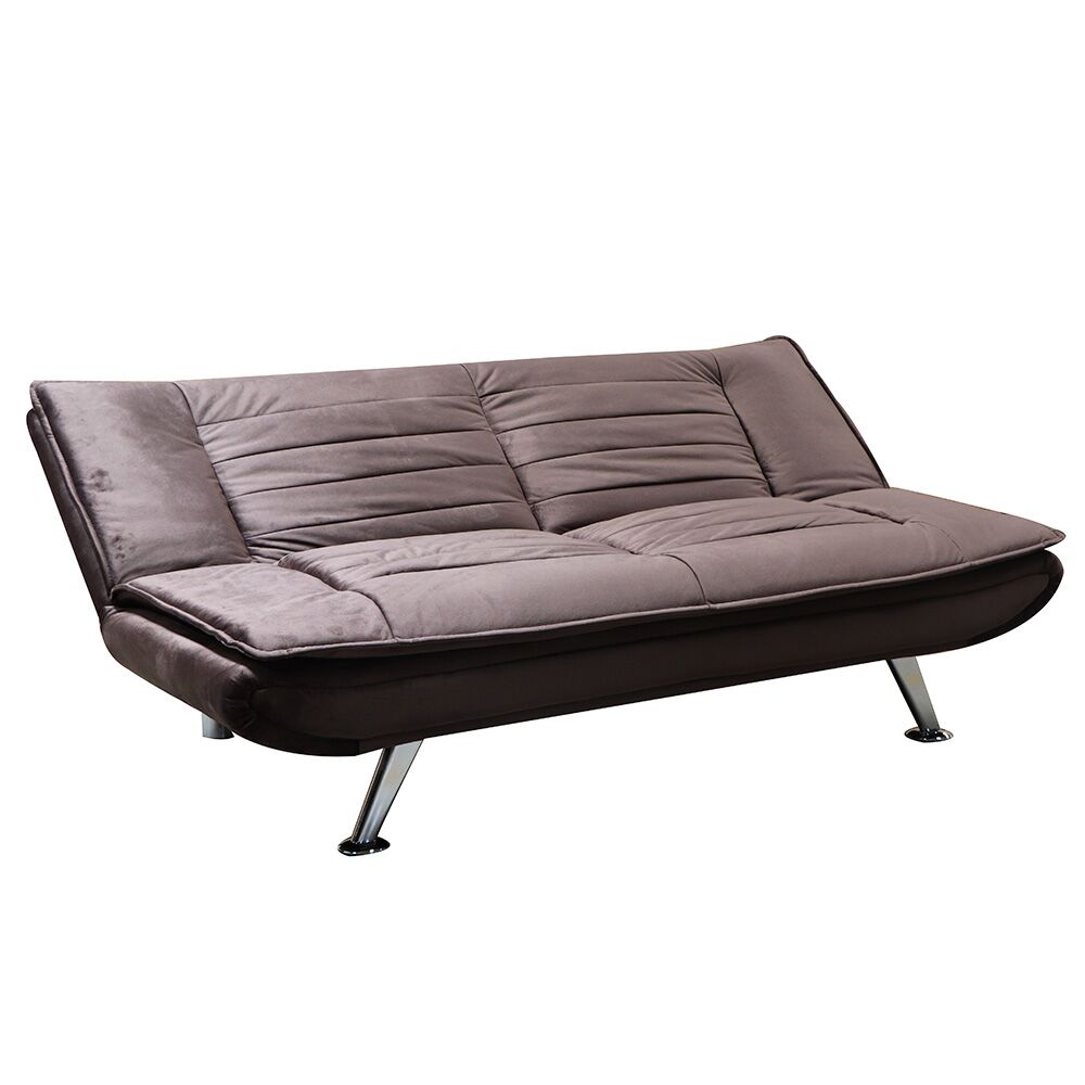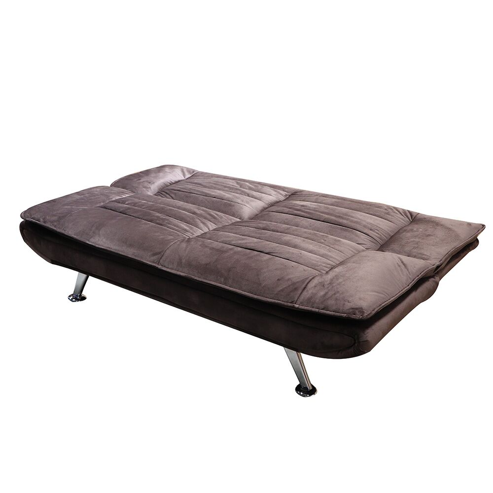 Materiales: Estructura de madera sólida y metal, tapizado en terciopelo café de alta densidad y patas de acero con acabado cromado plateado. Sistema de apertura fácil tipo clic-clac.
