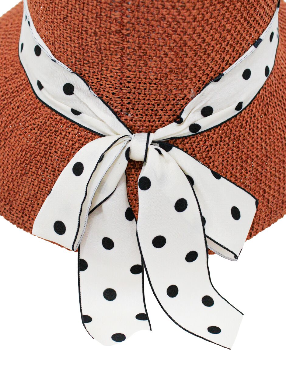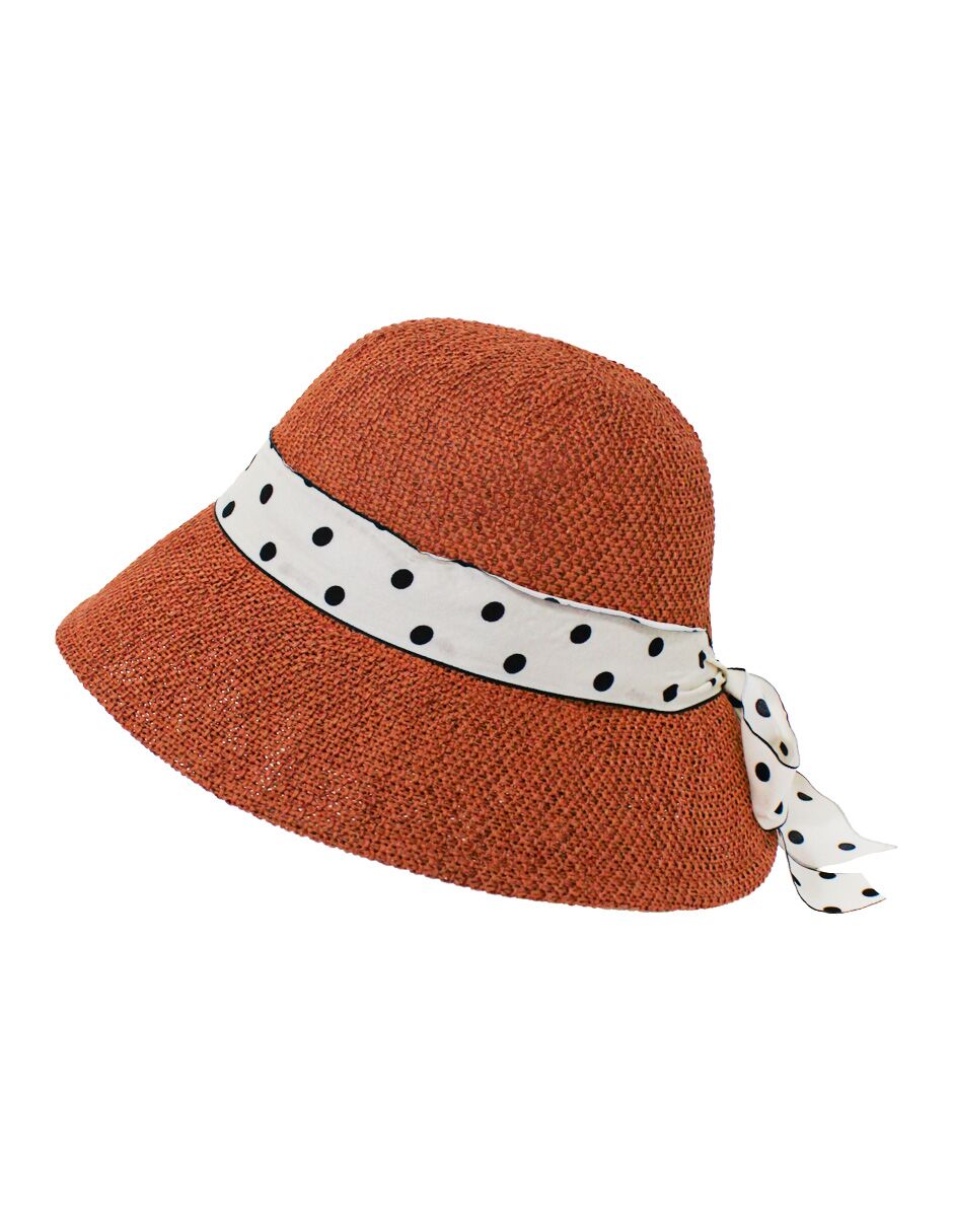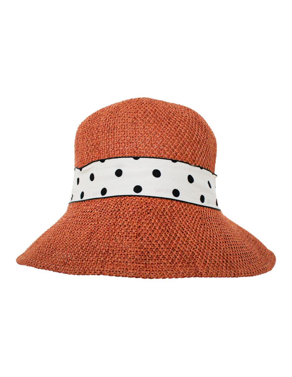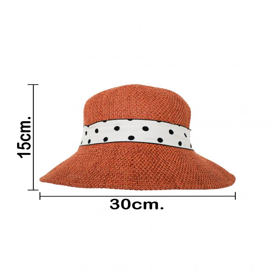 Sombrero tejido naranja con listón blanco y puntos negros de 30x30x15cm