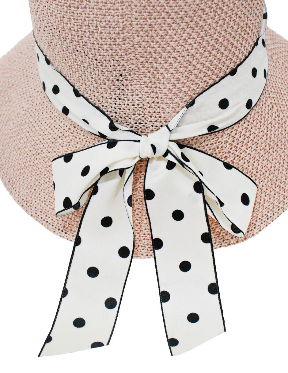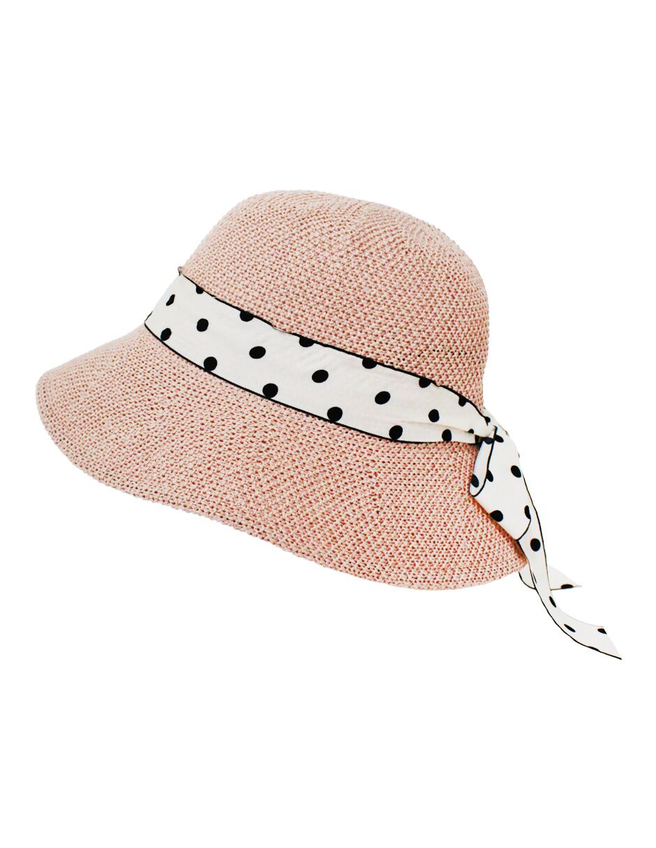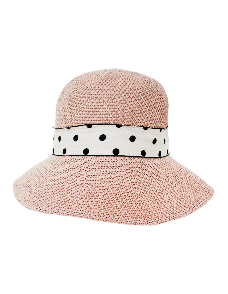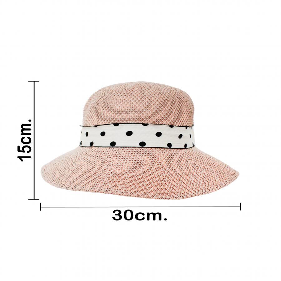 Sombrero tejido rosa con listón blanco y puntos negros de30x30x15cm