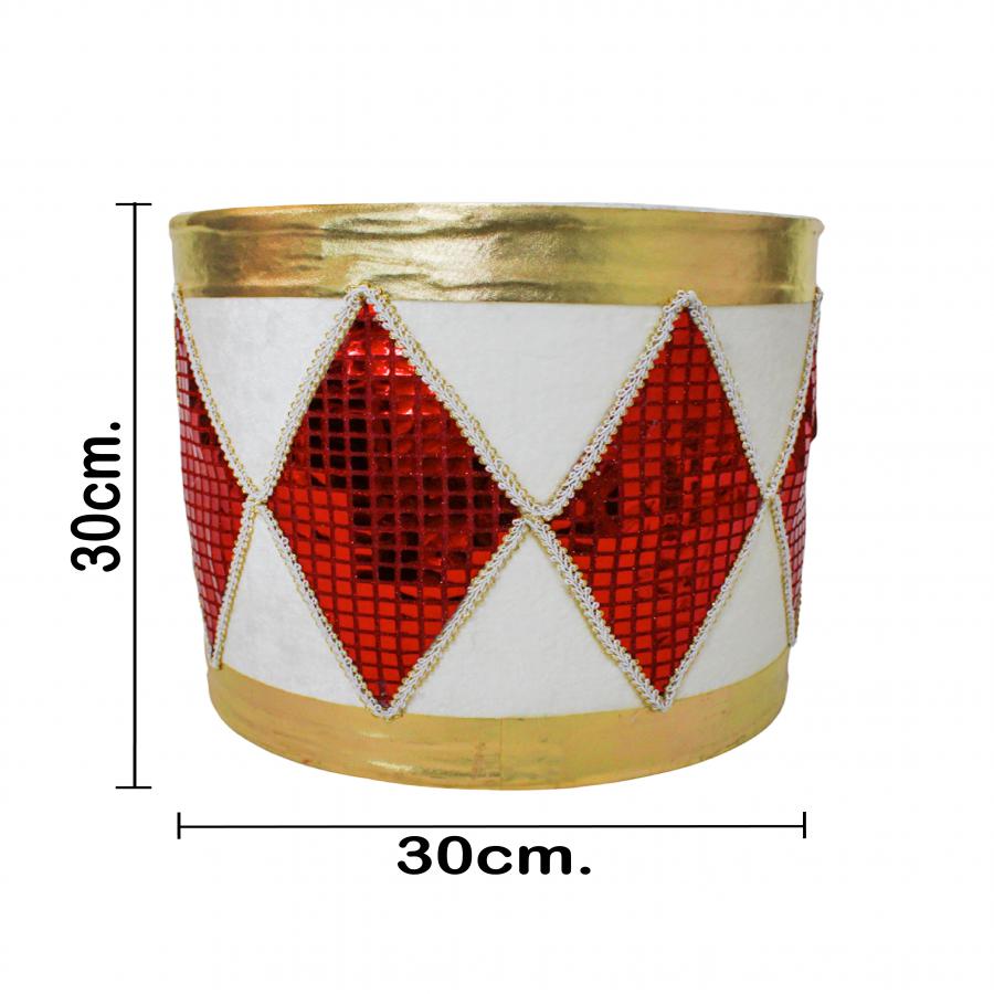 La elegancia de la Navidad en un tambor decorativo. Este tambor blanco con rombos rojos y orilla dorada es la pieza perfecta para decorar tu hogar en la temporada festiva. Con sus medidas de 30x30x30cm, su diseño lleno de detalles evoca alegría y calidez.