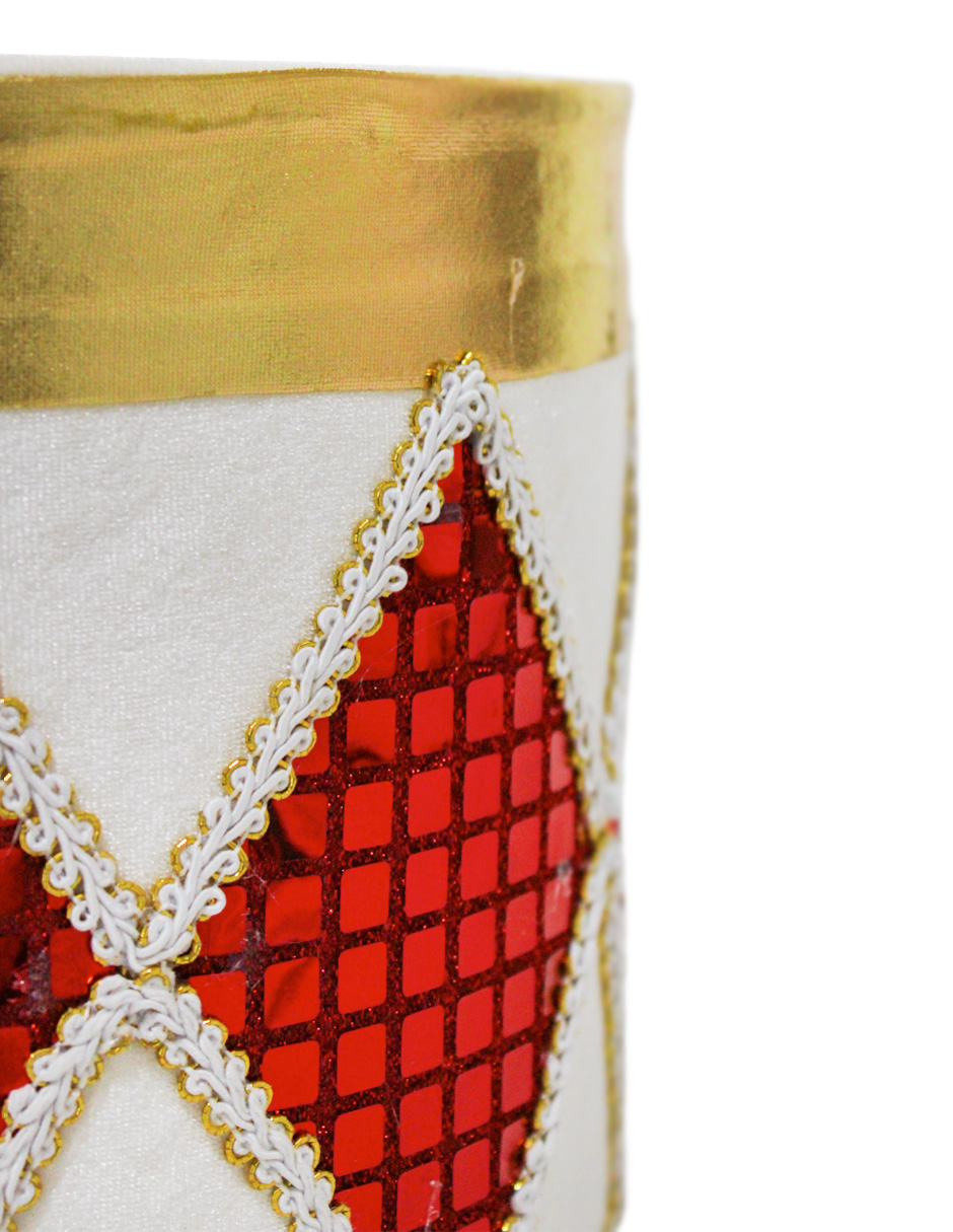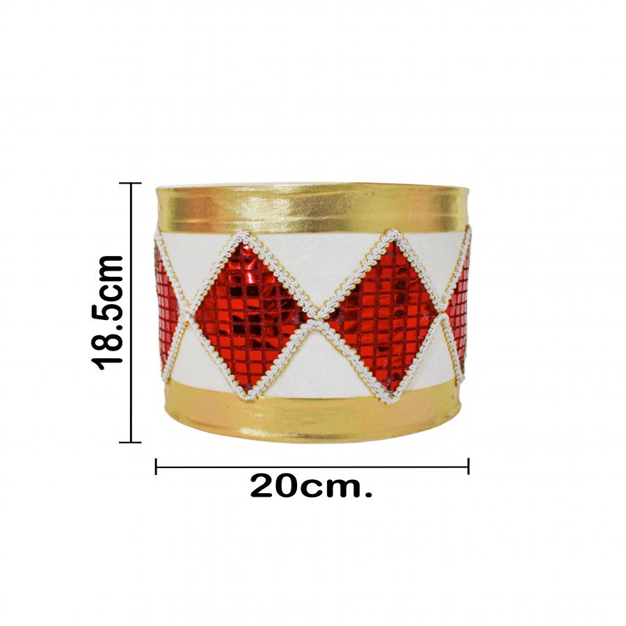 La elegancia de la Navidad en un tambor decorativo. Este tambor blanco con rombos rojos y orilla dorada es la pieza perfecta para decorar tu hogar en la temporada festiva. Con sus medidas de 20x20x18cm, su diseño lleno de detalles evoca alegría y calidez.