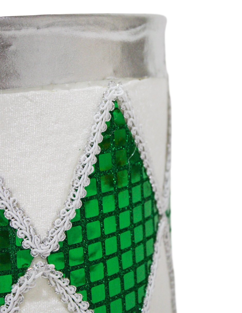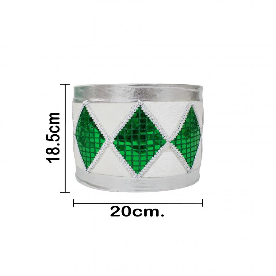 La elegancia de la Navidad en un tambor decorativo. Este tambor blanco con rombos verdes y orilla plateada es la pieza perfecta para decorar tu hogar en la temporada festiva. Con sus medidas de 20x20x18cm, su diseño lleno de detalles evoca alegría y calidez.
