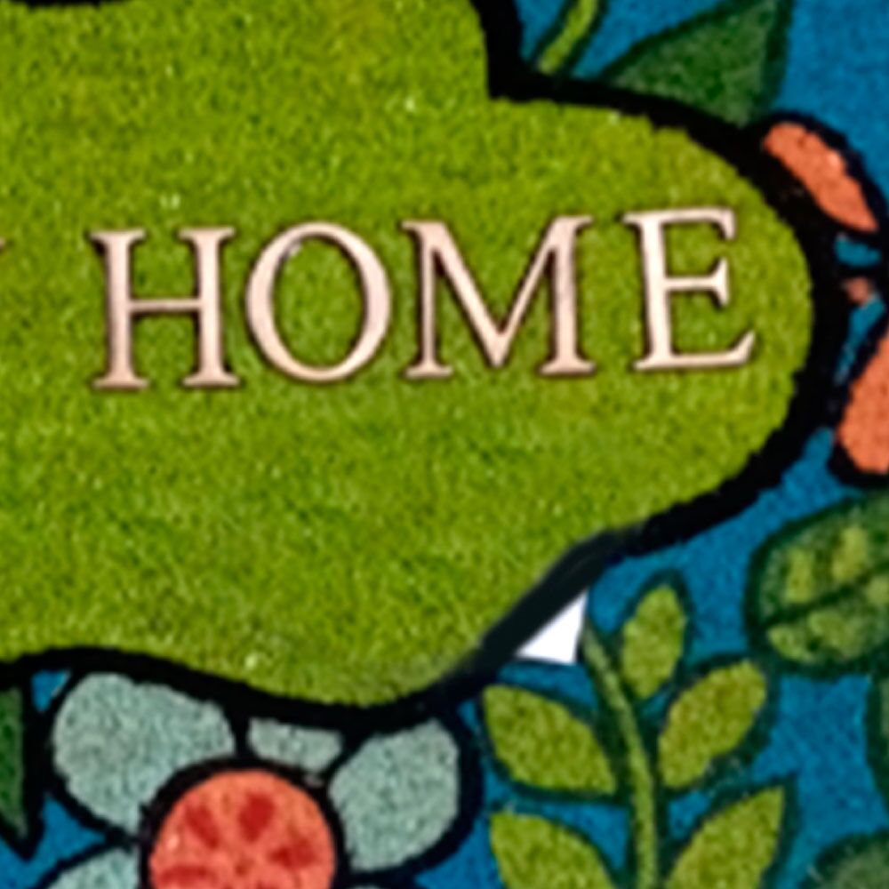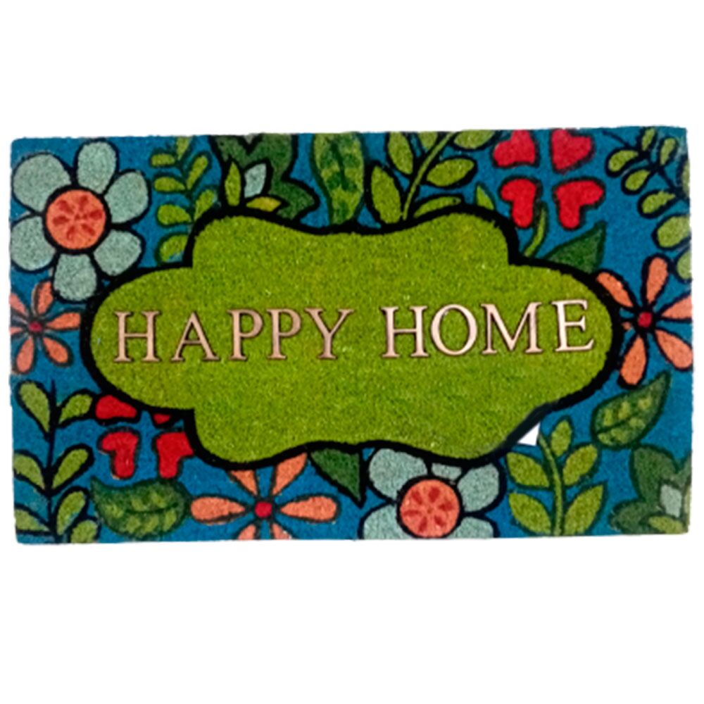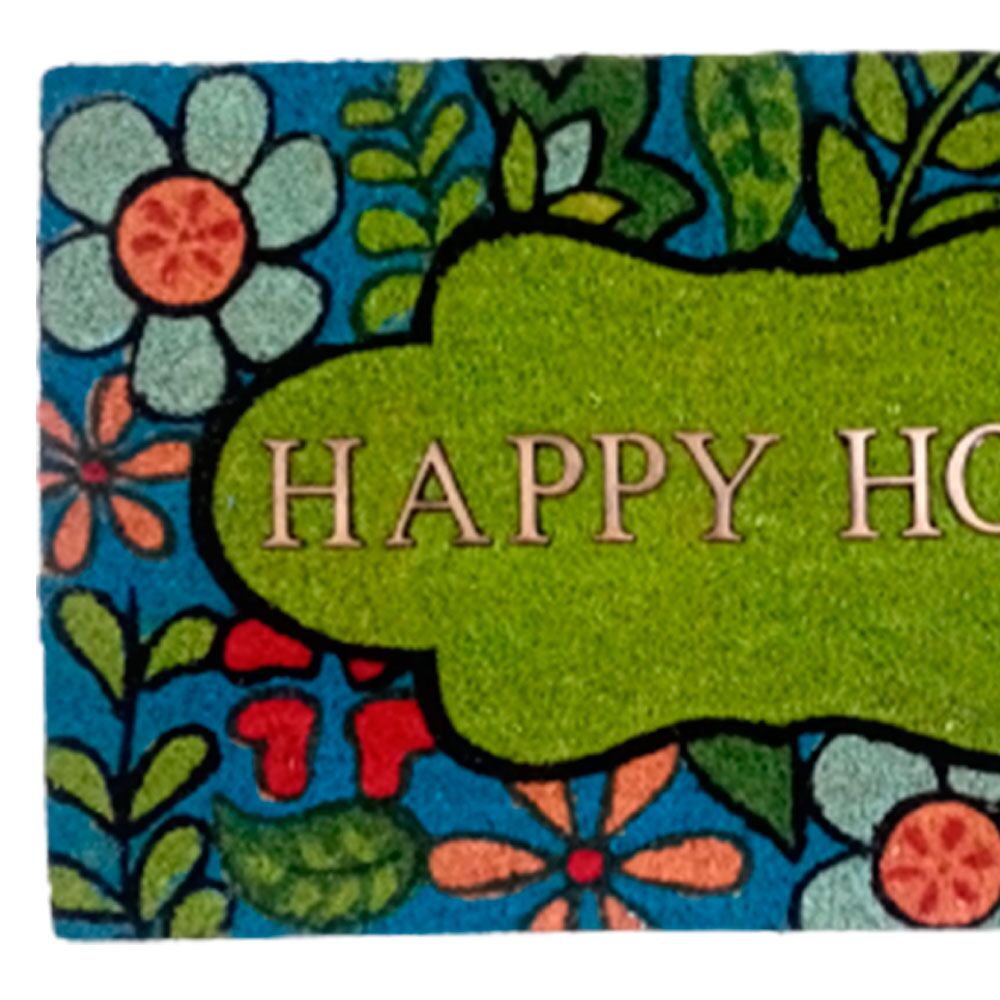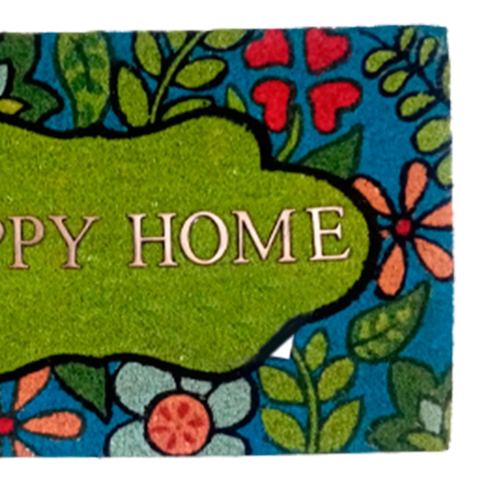Tapete de PVC lejía estampado flores de colores leyenda HAPPY HOME de 45x75cm
