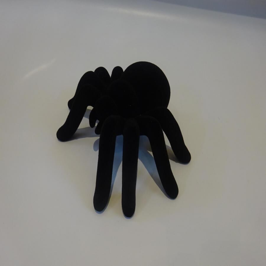 Una tarántula decorativa de 16×12.5x6cm con un acabado flocado en color negro. Esta pieza es ideal para una decoración de Halloween aterradora, perfecta para repisas o mesas de centro.