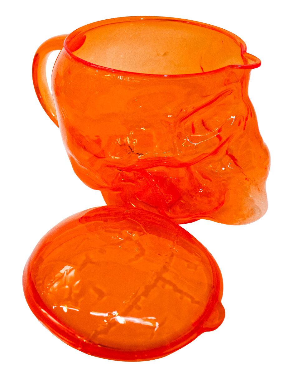 Un toque de misterio y estilo para tus bebidas. Esta jarra de acrílico con forma de cráneo, con un tamaño de 26.6×15.2×19.68cm, es la pieza perfecta para añadir un aire de originalidad y encanto a tu bar o cocina. Con un diseño detallado que muestra un cráneo translúcido de color naranja y una tapa para servir tus bebidas, su figura crea un ambiente lleno de vida, ideal para una fiesta o evento temático, y sorprenderá a tus invitados con su diseño único y llamativo.
