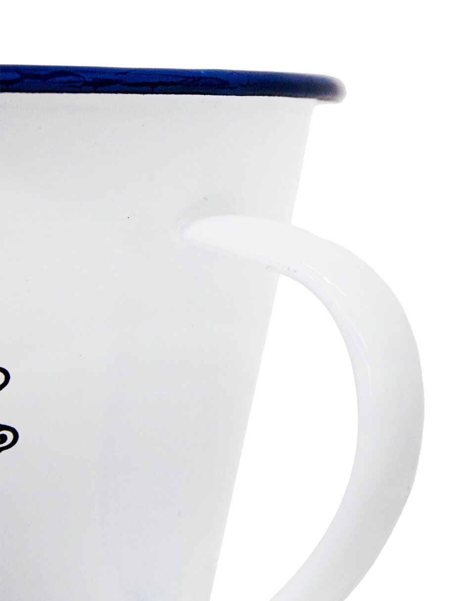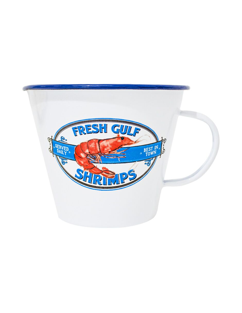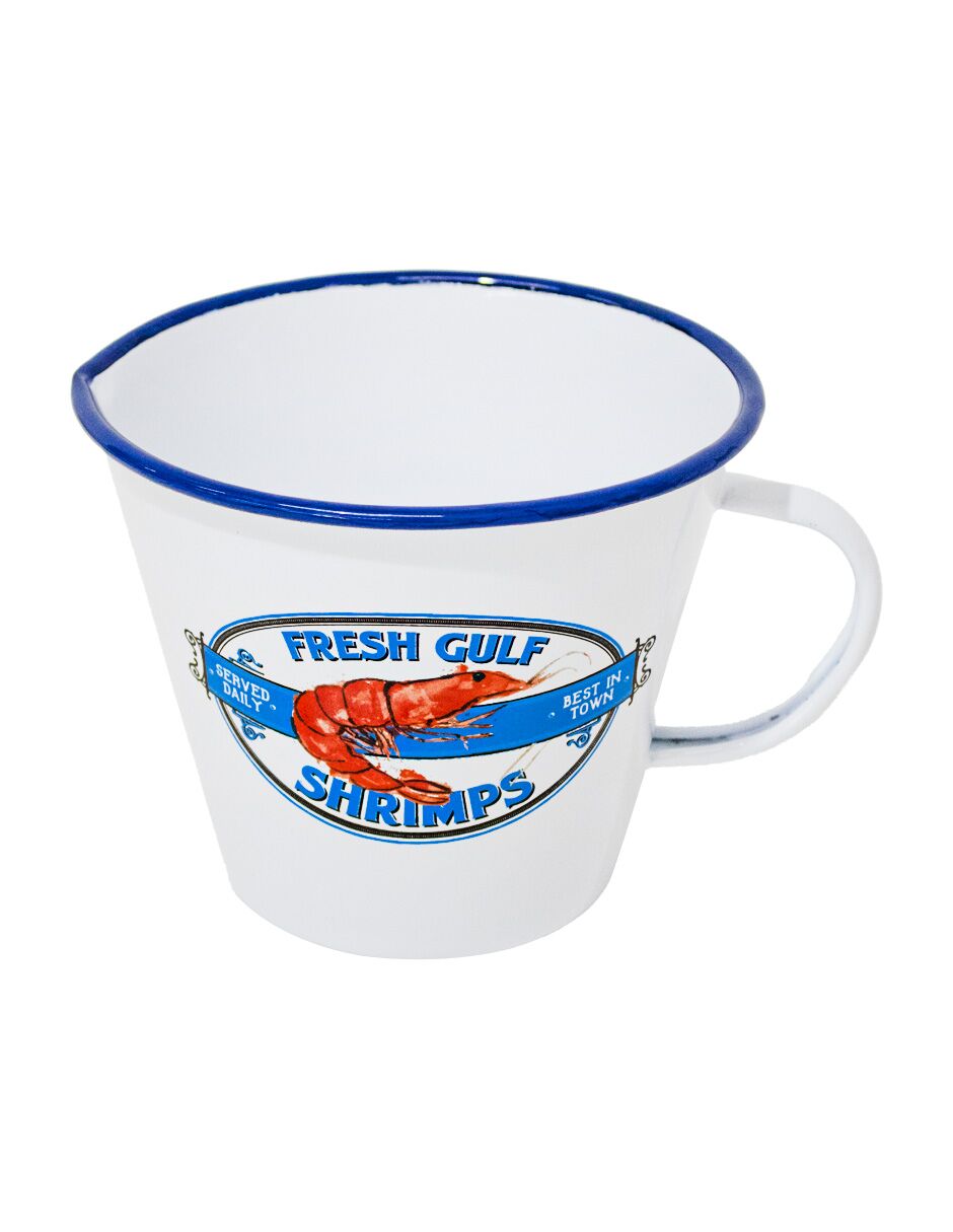 Disfruta tu bebida con un toque tropical. Esta taza de peltre blanca con estampado de camarón es perfecta para tu cocina. Su diseño te hará sentir la alegría y la diversión del verano. Mide 10.5×10.5x9cm.