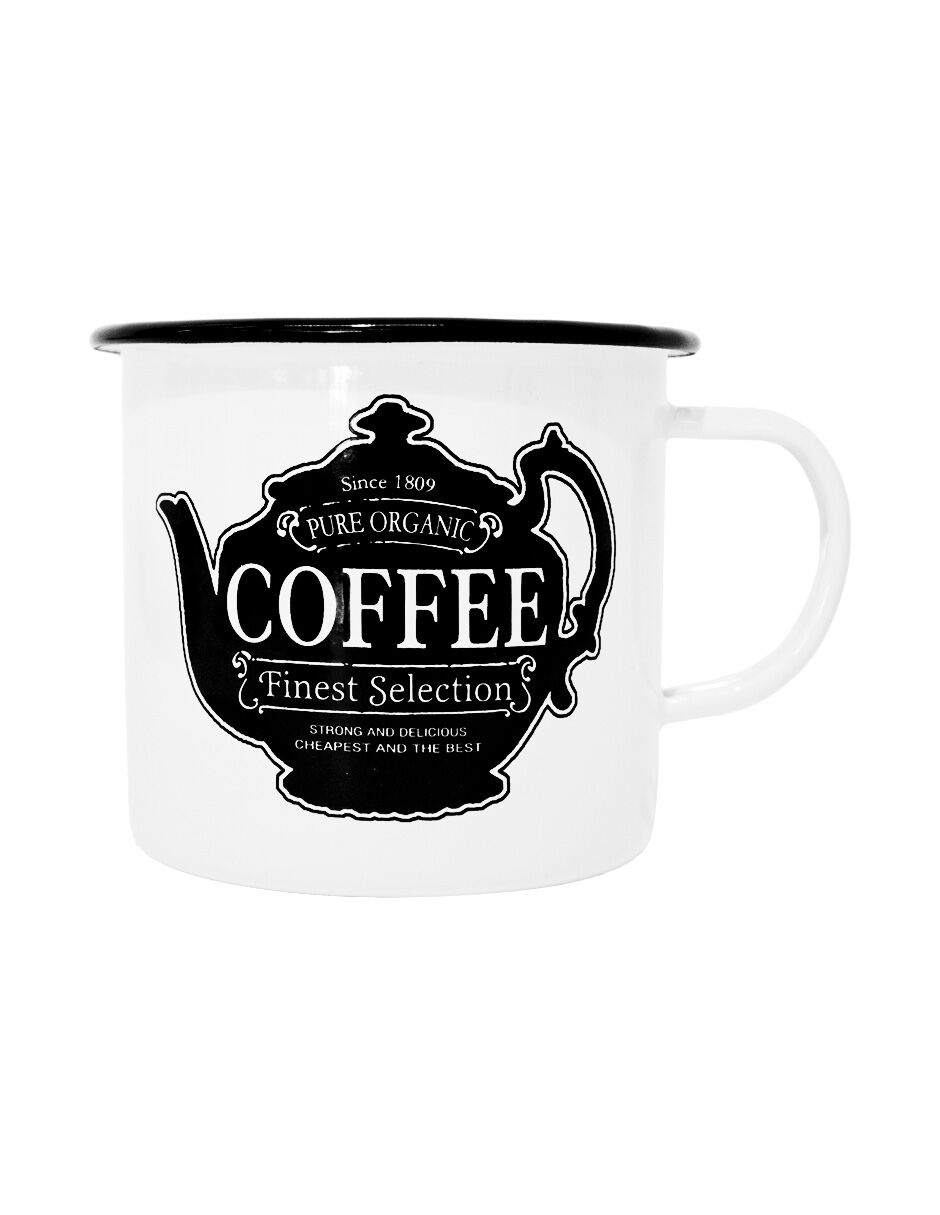 Disfruta tu bebida con un toque vintage. Esta taza de peltre blanca con estampado de cafetera y texto “COFFE” es perfecta para tu cocina. Su diseño te hará sentir la calidez y la comodidad en tu hogar. Mide 11x11x10cm.