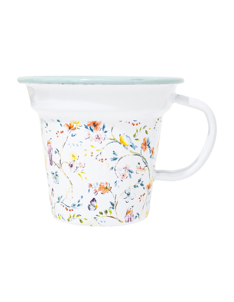 Disfruta tu bebida con un toque rústico. Esta taza de peltre blanca con estampado de flores es perfecta para tu cocina. Su diseño te hará sentir la calidez y la autenticidad de la vida en el campo. Mide 10.5×10.5x9cm.