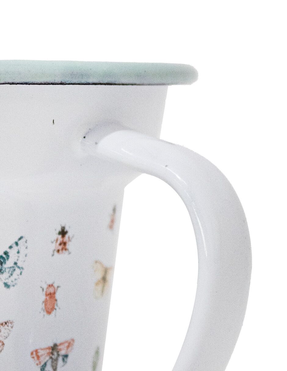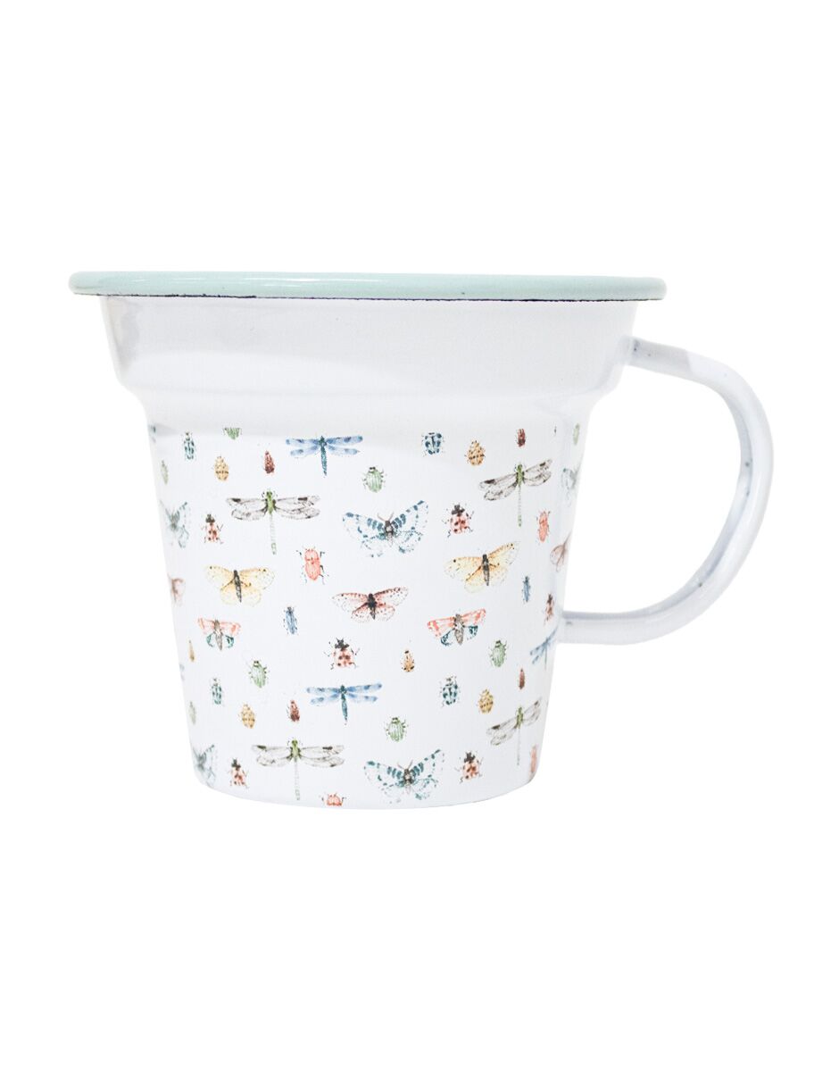 Disfruta tu bebida con un toque rústico. Esta taza de peltre blanca con estampado de insectos es perfecta para tu cocina. Su diseño te hará sentir la calidez y la autenticidad de la vida en el campo. Mide 10.5×10.5x9cm.