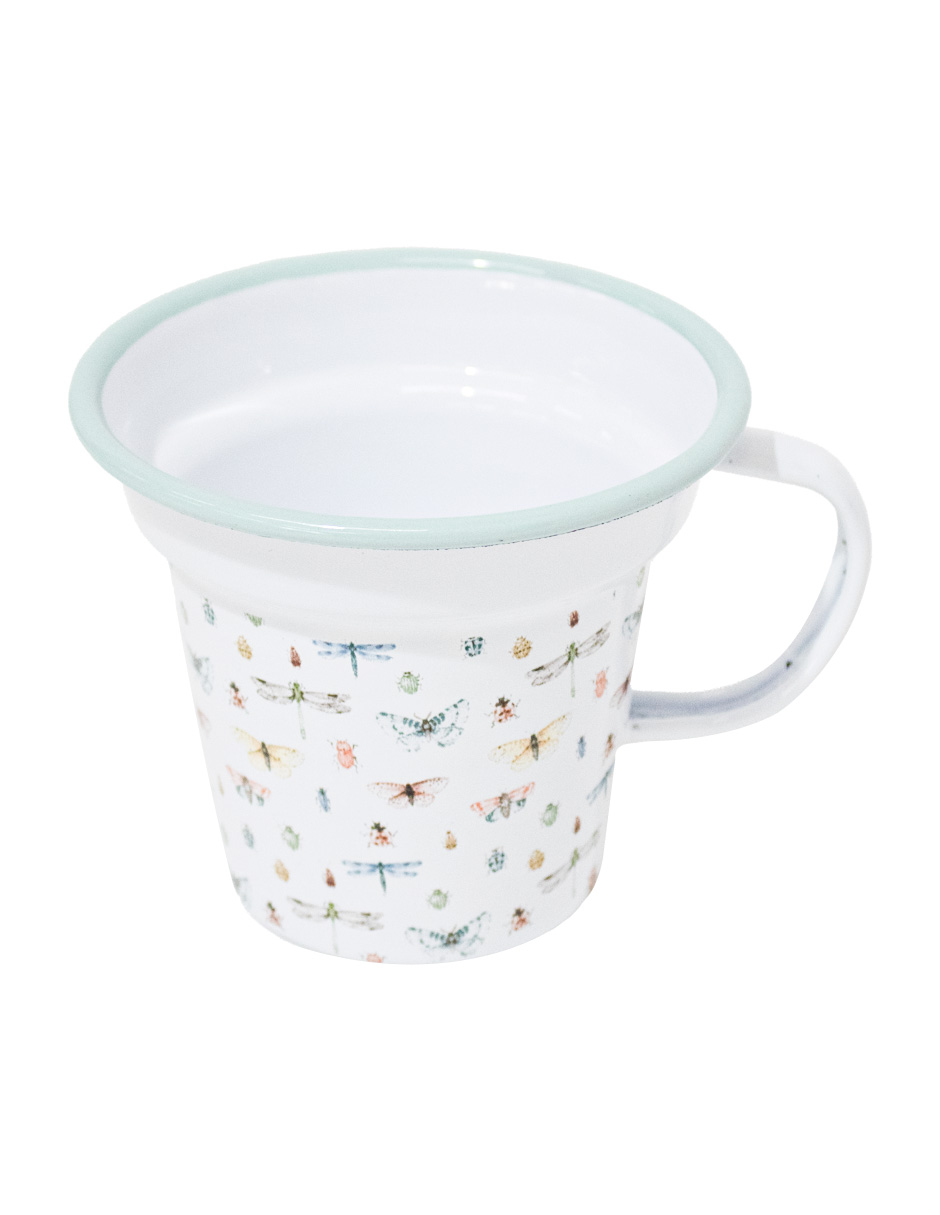 Disfruta tu bebida con un toque rústico. Esta taza de peltre blanca con estampado de insectos es perfecta para tu cocina. Su diseño te hará sentir la calidez y la autenticidad de la vida en el campo. Mide 10.5×10.5x9cm.