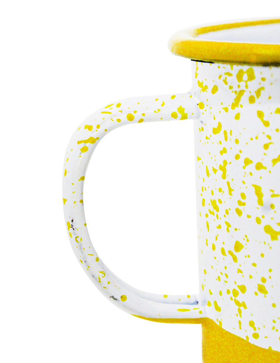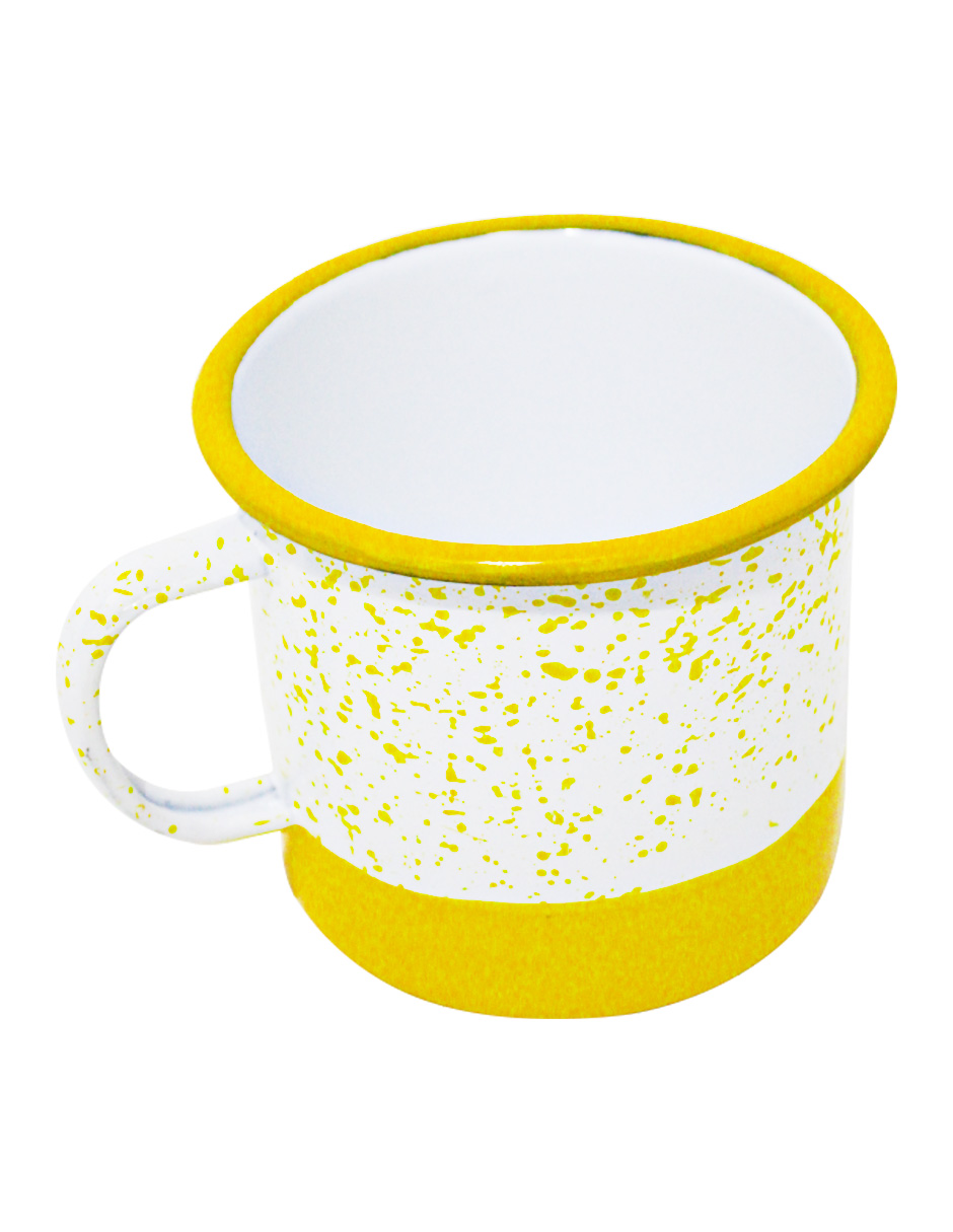 Disfruta tu bebida con un toque moderno y alegre. Esta taza de peltre amarillo con blanco y puntos es perfecta para tu cocina. Su diseño te hará sentir la alegría y la diversión. Mide 11x11x10cm.
