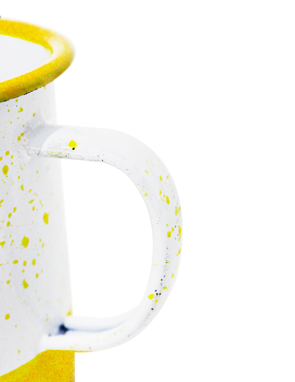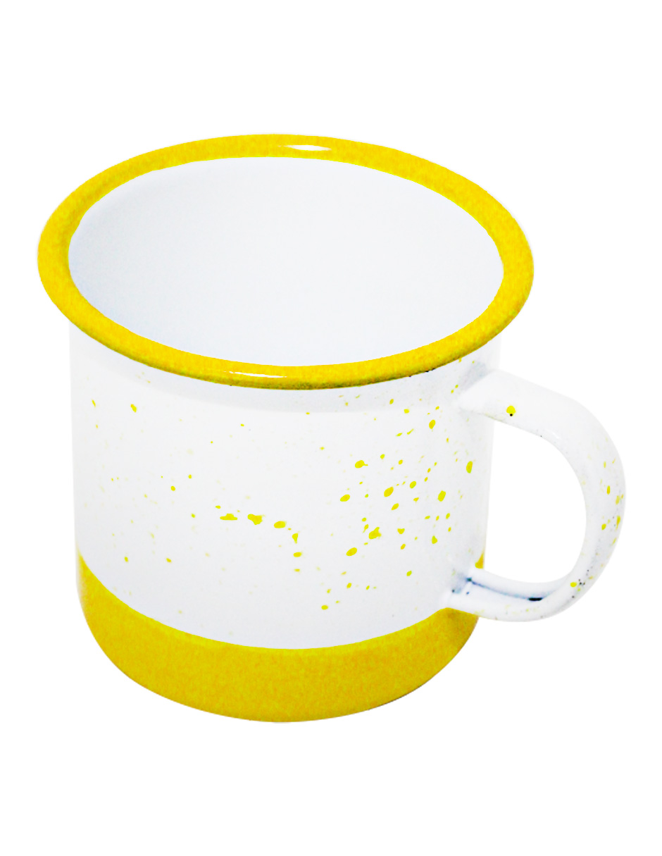 Disfruta tu bebida con un toque moderno y alegre. Esta taza de peltre amarillo con blanco y puntos es perfecta para tu cocina. Su diseño te hará sentir la alegría y la diversión. Mide 10x10x9.5cm.