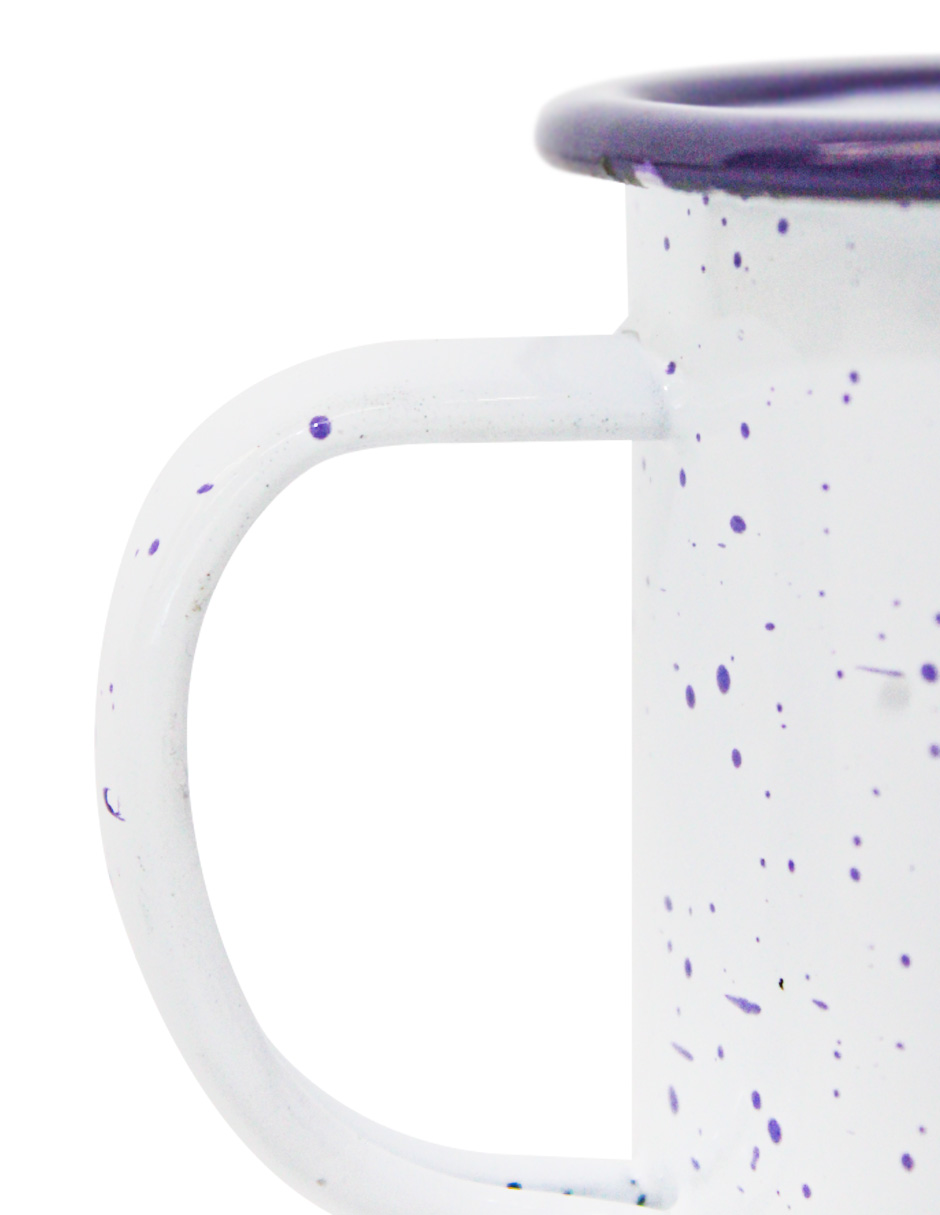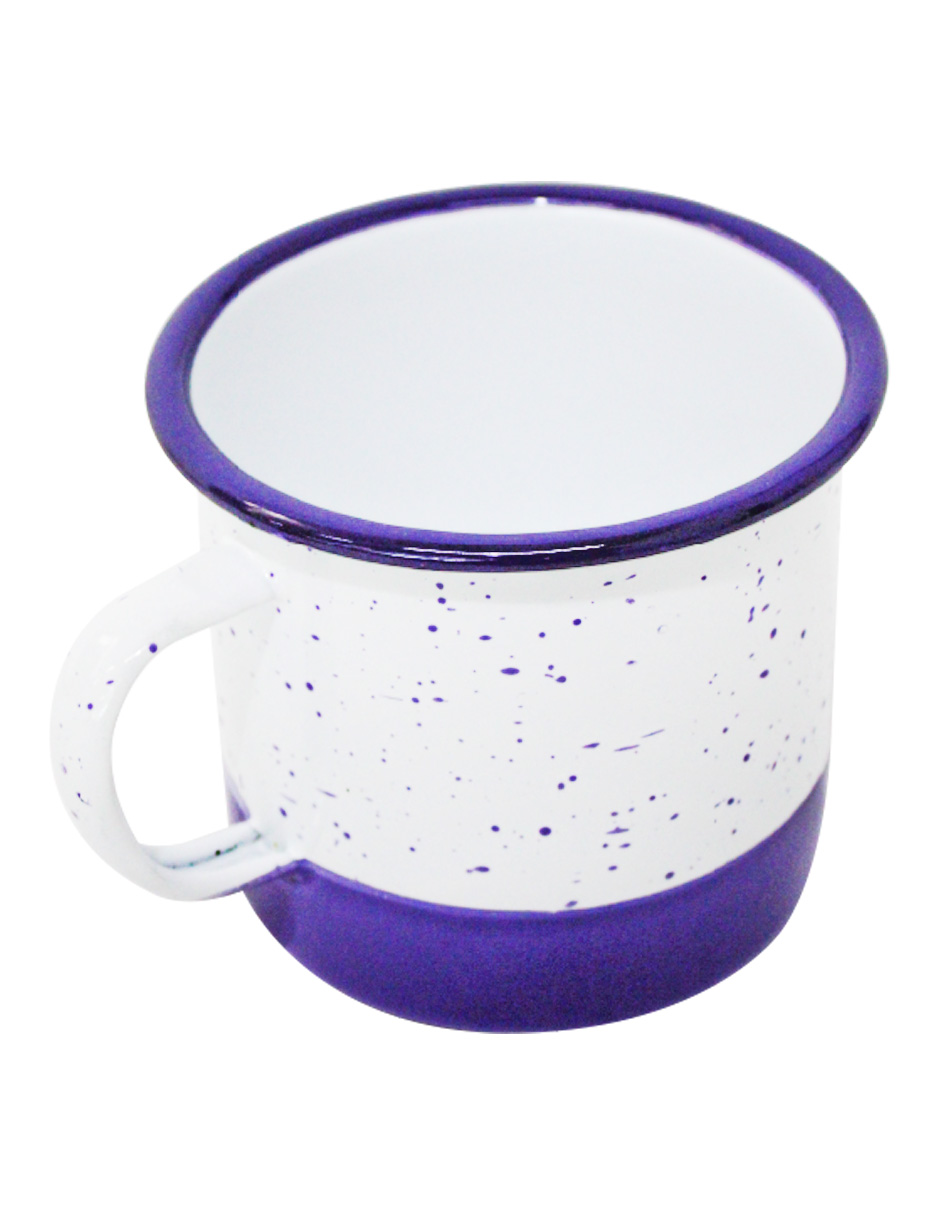 Disfruta tu bebida con un toque moderno y alegre. Esta taza de peltre morado con blanco y puntos es perfecta para tu cocina. Su diseño te hará sentir la alegría y la diversión. Mide 11x11x10cm.