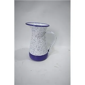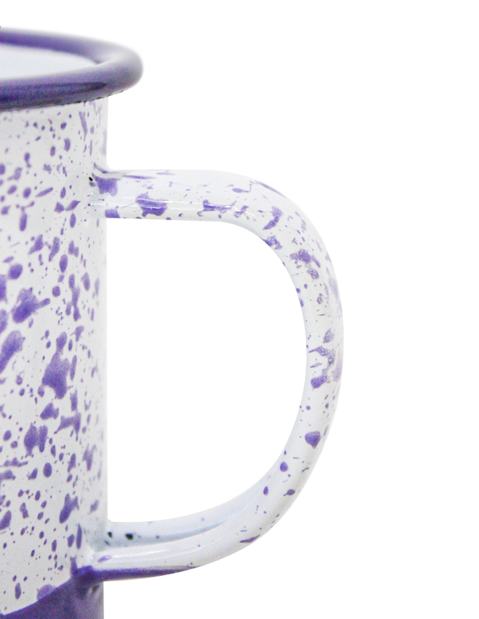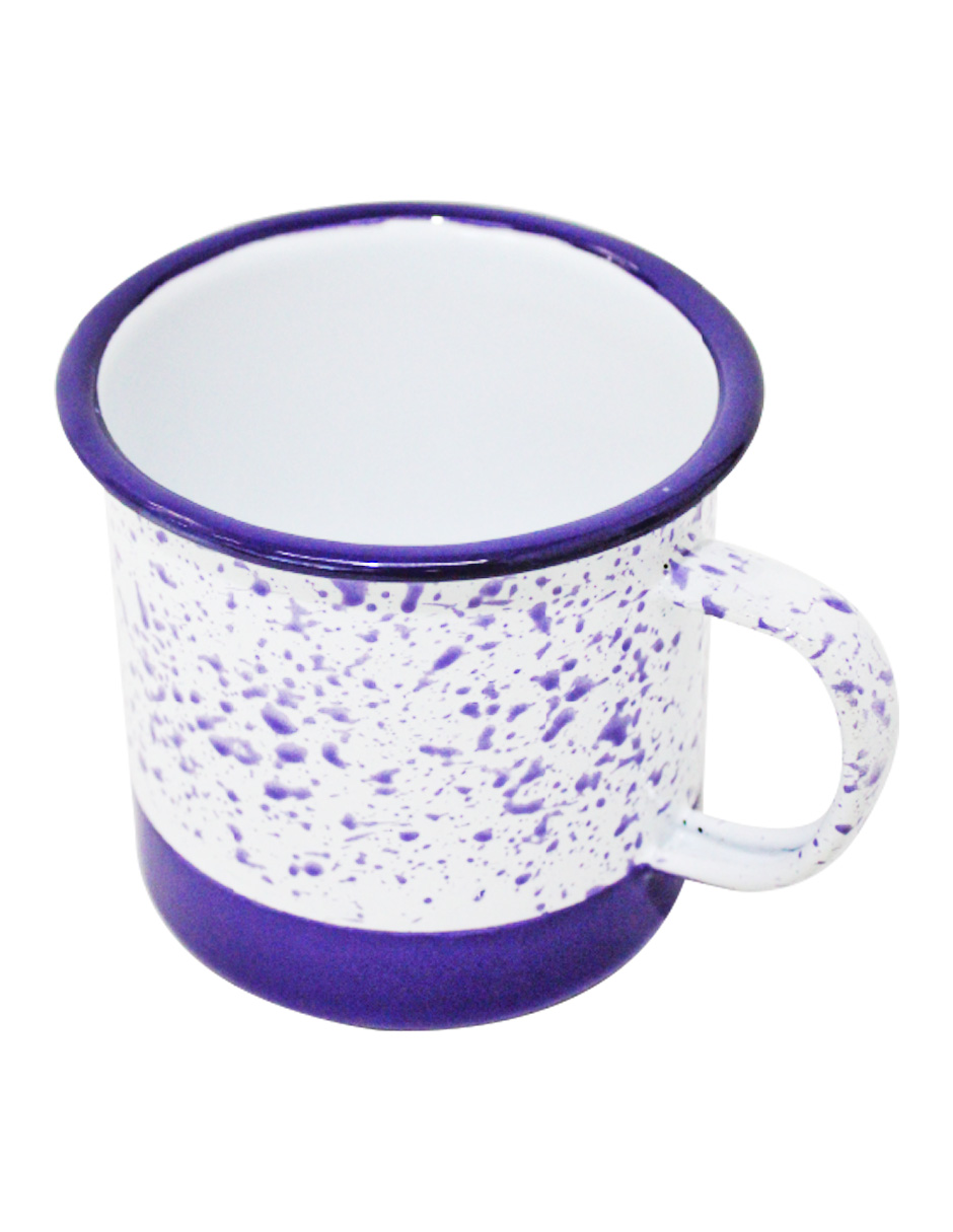 Disfruta tu bebida con un toque moderno y alegre. Esta taza de peltre morado con blanco y puntos es perfecta para tu cocina. Su diseño te hará sentir la alegría y la diversión. Mide 10x10x9.5cm.