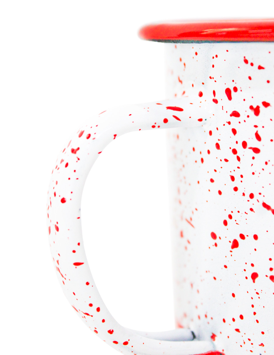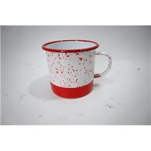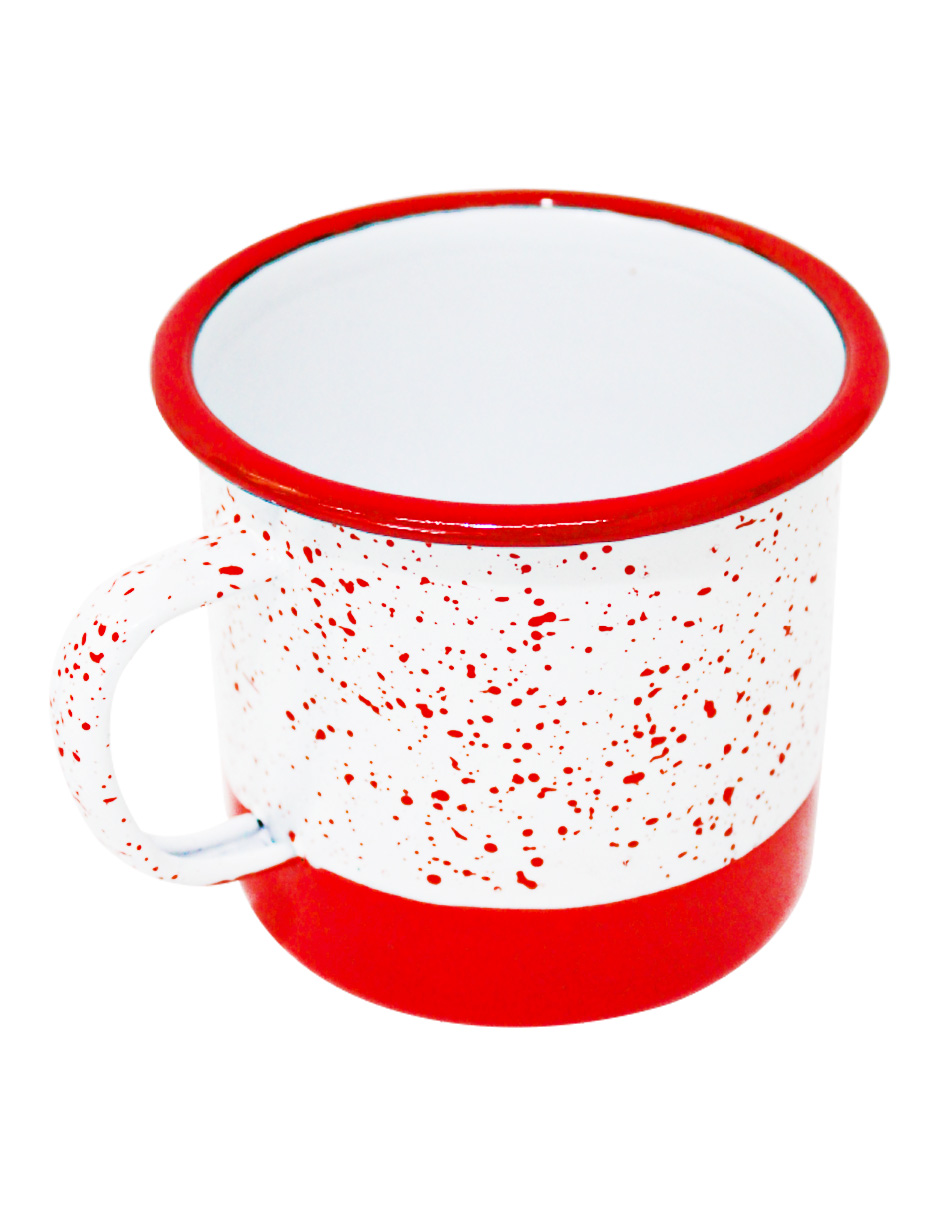 Disfruta tu bebida con un toque moderno y alegre. Esta taza de peltre rojo con blanco y puntos es perfecta para tu cocina. Su diseño te hará sentir la alegría y la diversión. Mide 11x11x10cm.