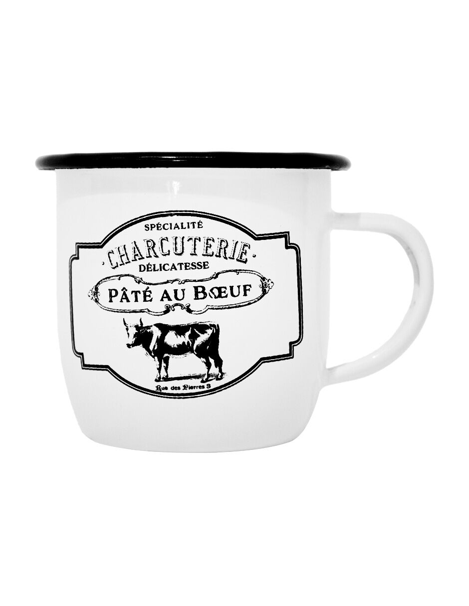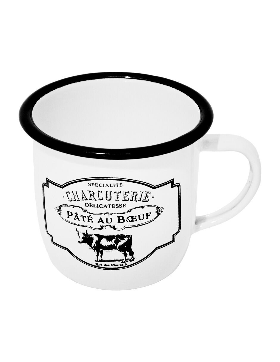 Disfruta tu bebida con un toque rústico. Esta taza de peltre blanca con estampado de vaca y diseño francés es perfecta para tu cocina. Su diseño te hará sentir la calidez y la autenticidad de la vida en la granja. Mide 9x9x8.5cm.