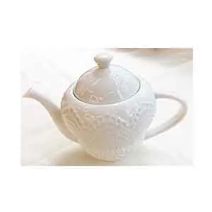 Tetera elegante fabricada en cerámica blanca con un distintivo diseño en relieve que simula encaje. Esta textura añade un toque vintage y sofisticado a la mesa del té. El material es cerámica.