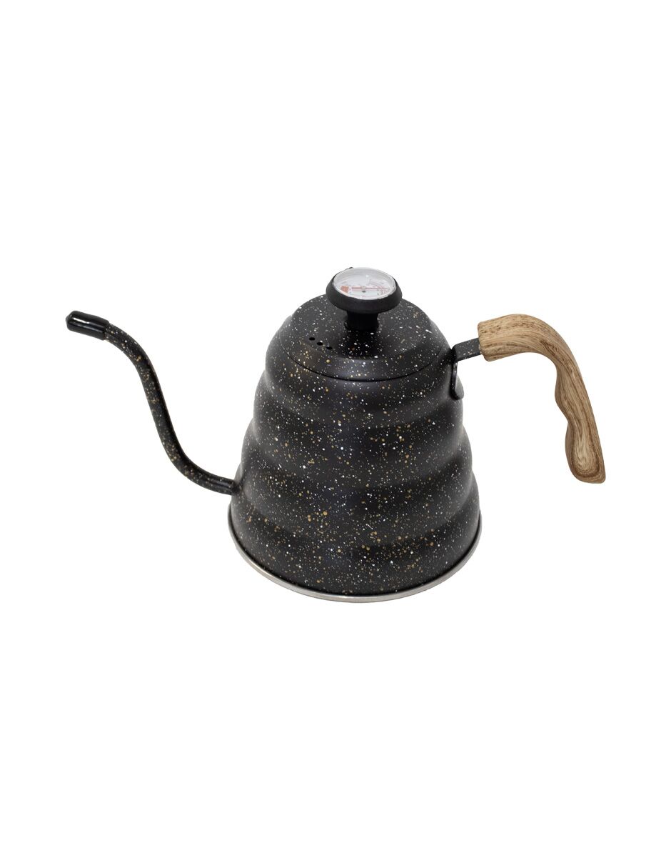 Tetera de diseño elegante de 1.2 litros. Fabricada en metal negro con detalles de puntos blancos. Incluye termómetro integrado para controlar la temperatura de infusión. Mango de madera para un agarre cómodo. El material es metal y madera.