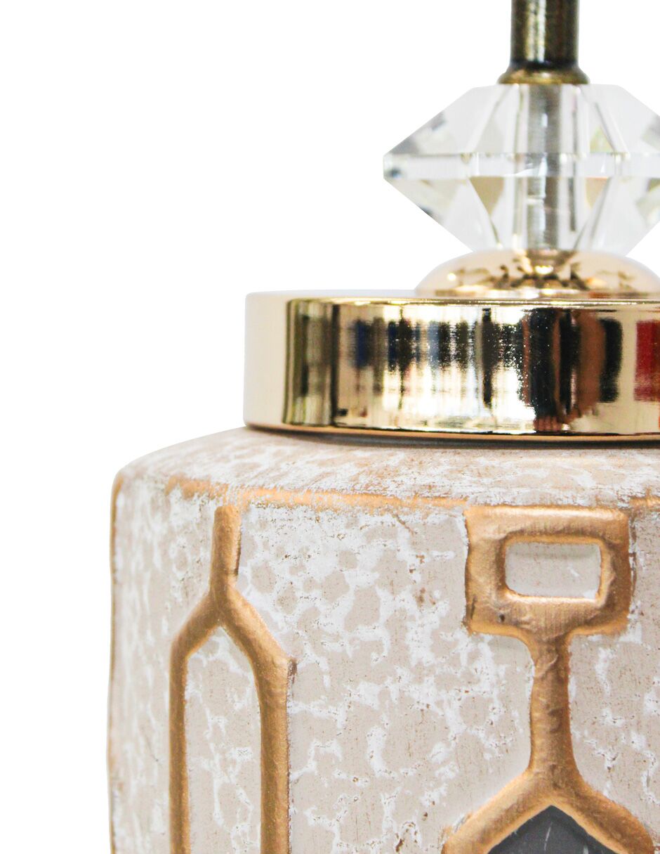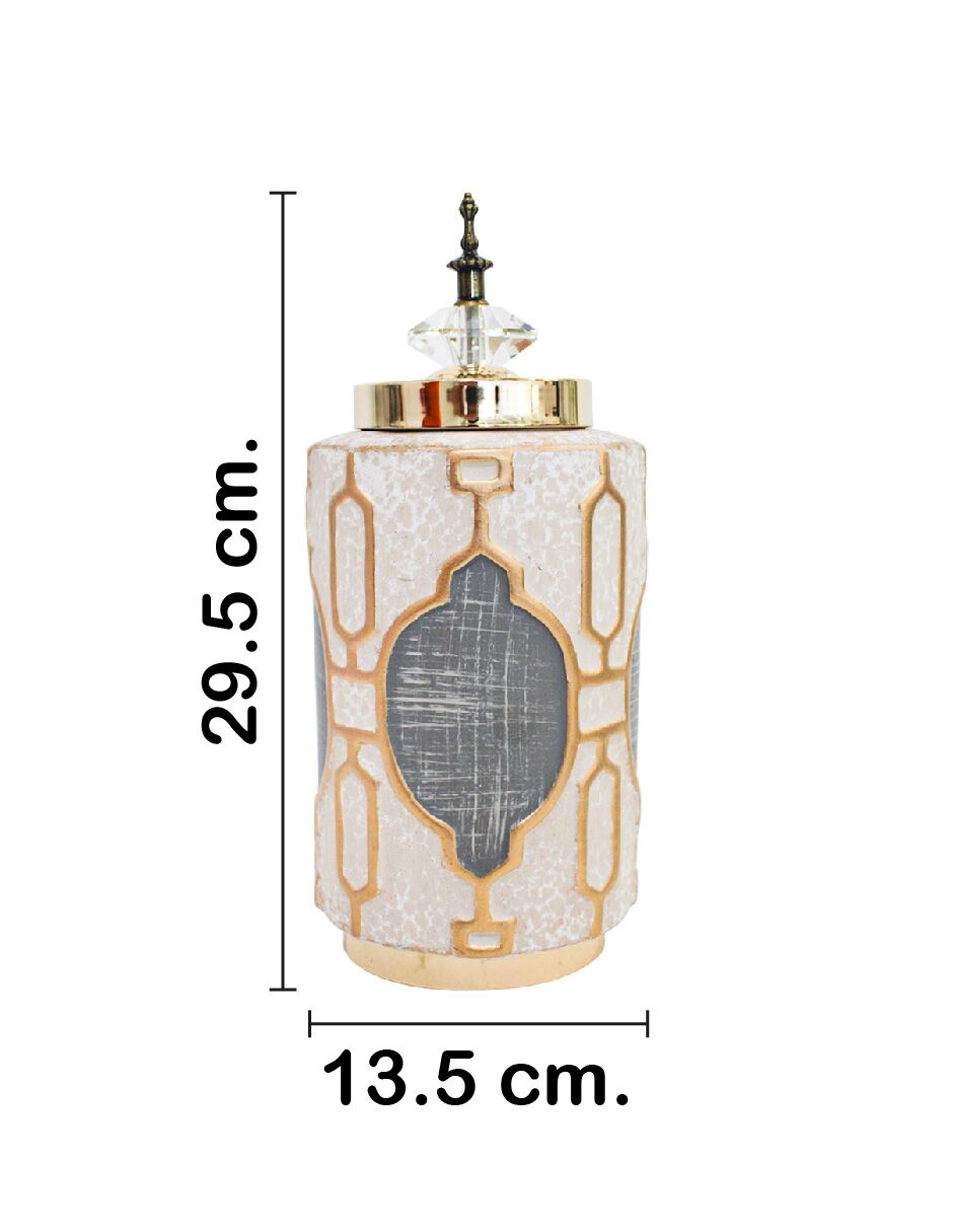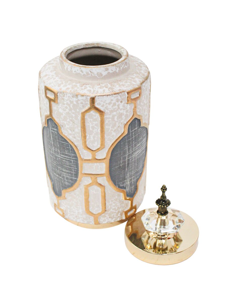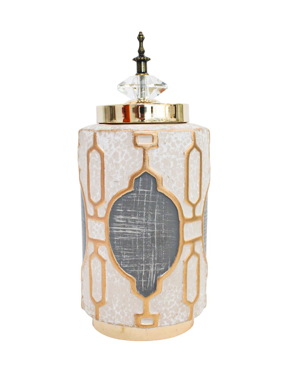 Tibor de cerámica beige con dorado y tapa imitacion diamante de 12x12x28cm