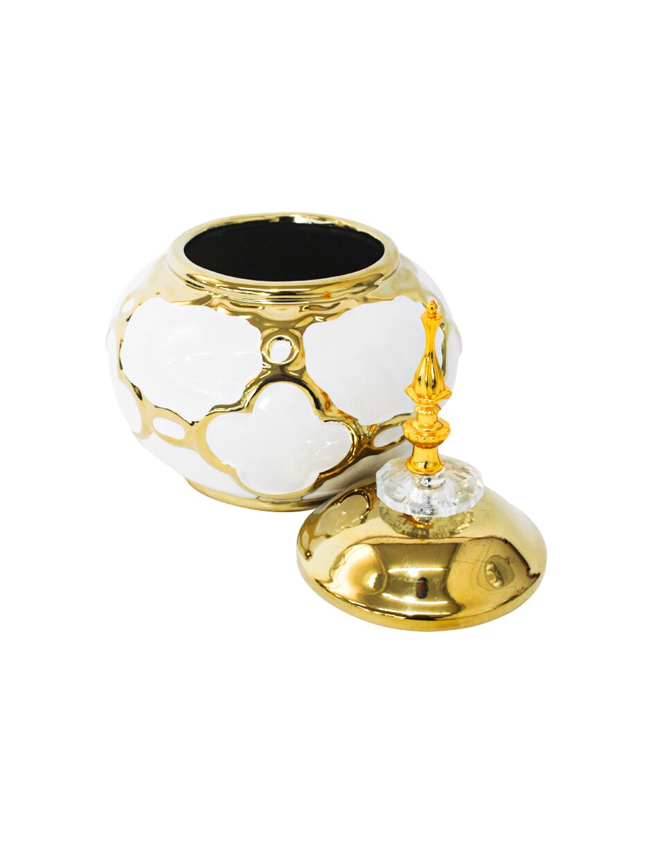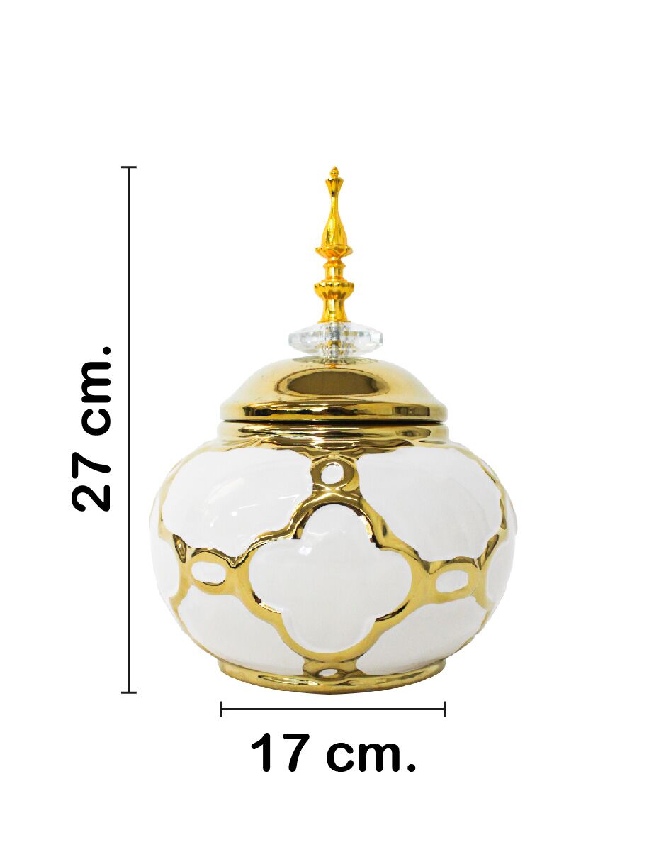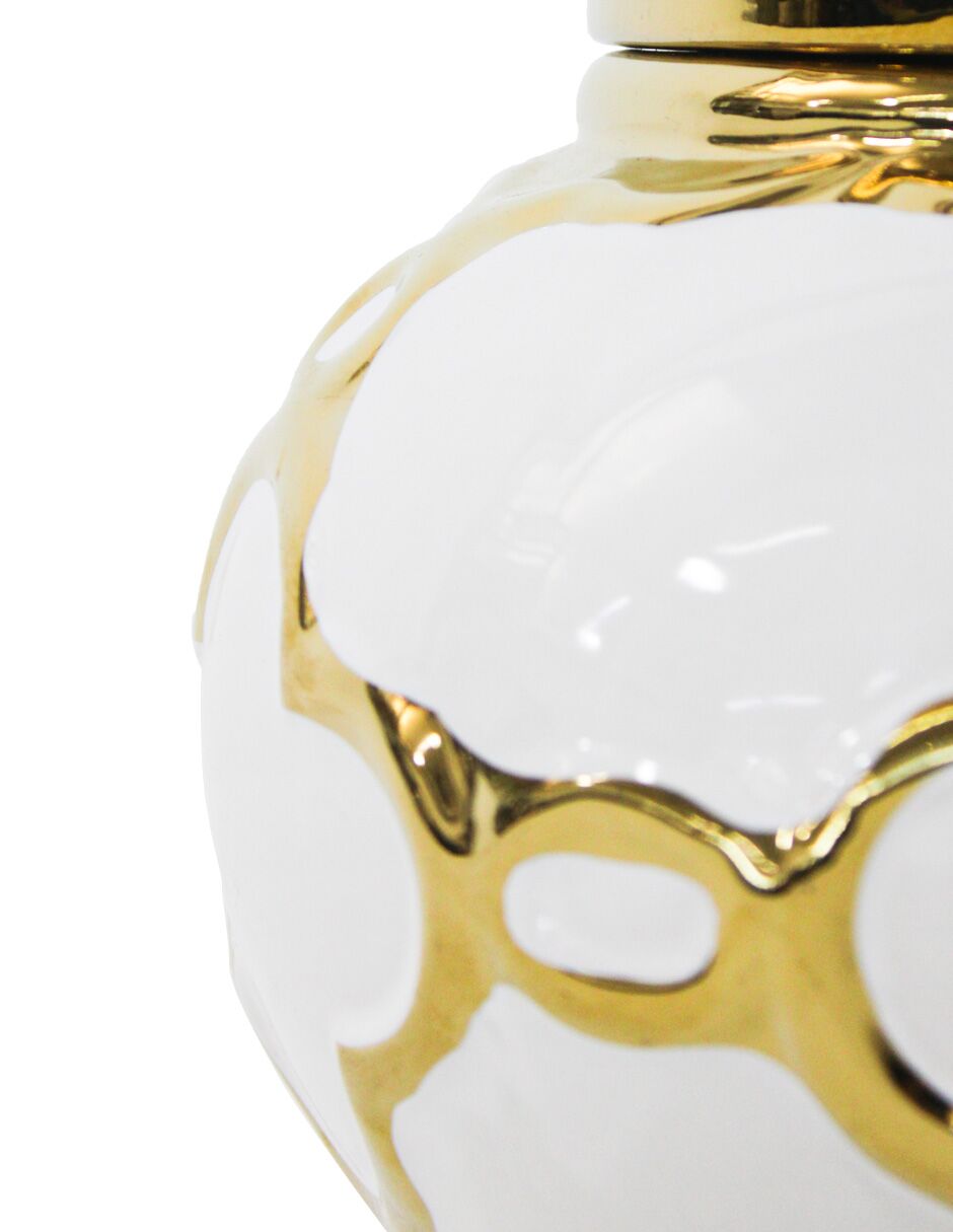 Tibor de cerámica blanco con diseños dorados de 17x17x27cm