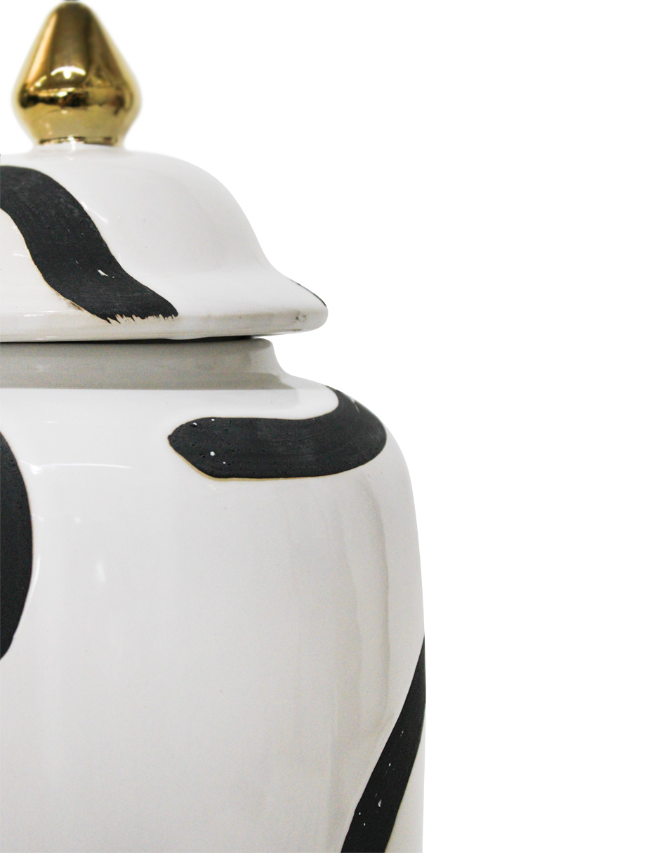 Inyecta un estilo artístico y una distinción moderna a tu espacio con este imponente tibor decorativo. Su diseño en cerámica con un patrón pincelado abstracto en elegantes tonos blanco y negro crea una pieza de máxima sofisticación y personalidad, evocando el arte contemporáneo. Es el acento perfecto para infundir elegancia, creatividad y un toque minimalista audaz en repisas, mesas auxiliares o consolas. Material: Cerámica. Medidas: 18 x 18 x 38 cm.