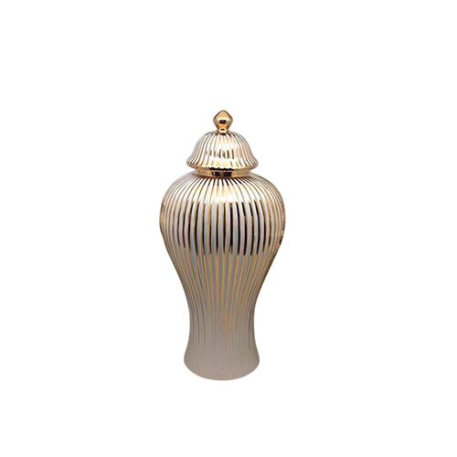 Tibor de cerámica blanco con lineas doradas de 15.5×15.5×29.5cm