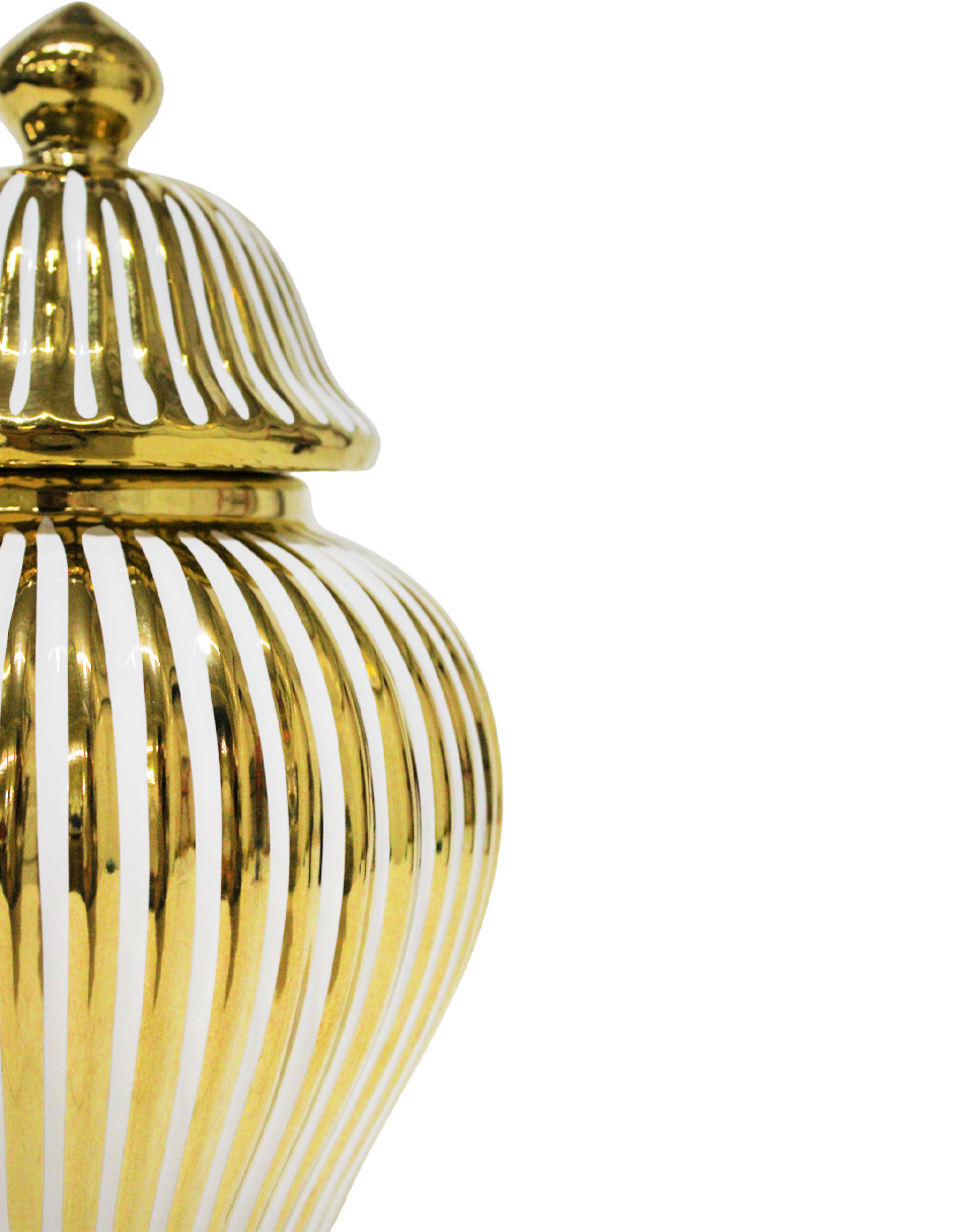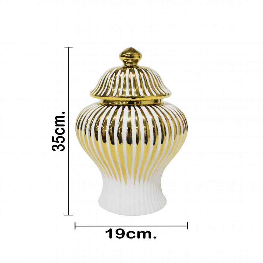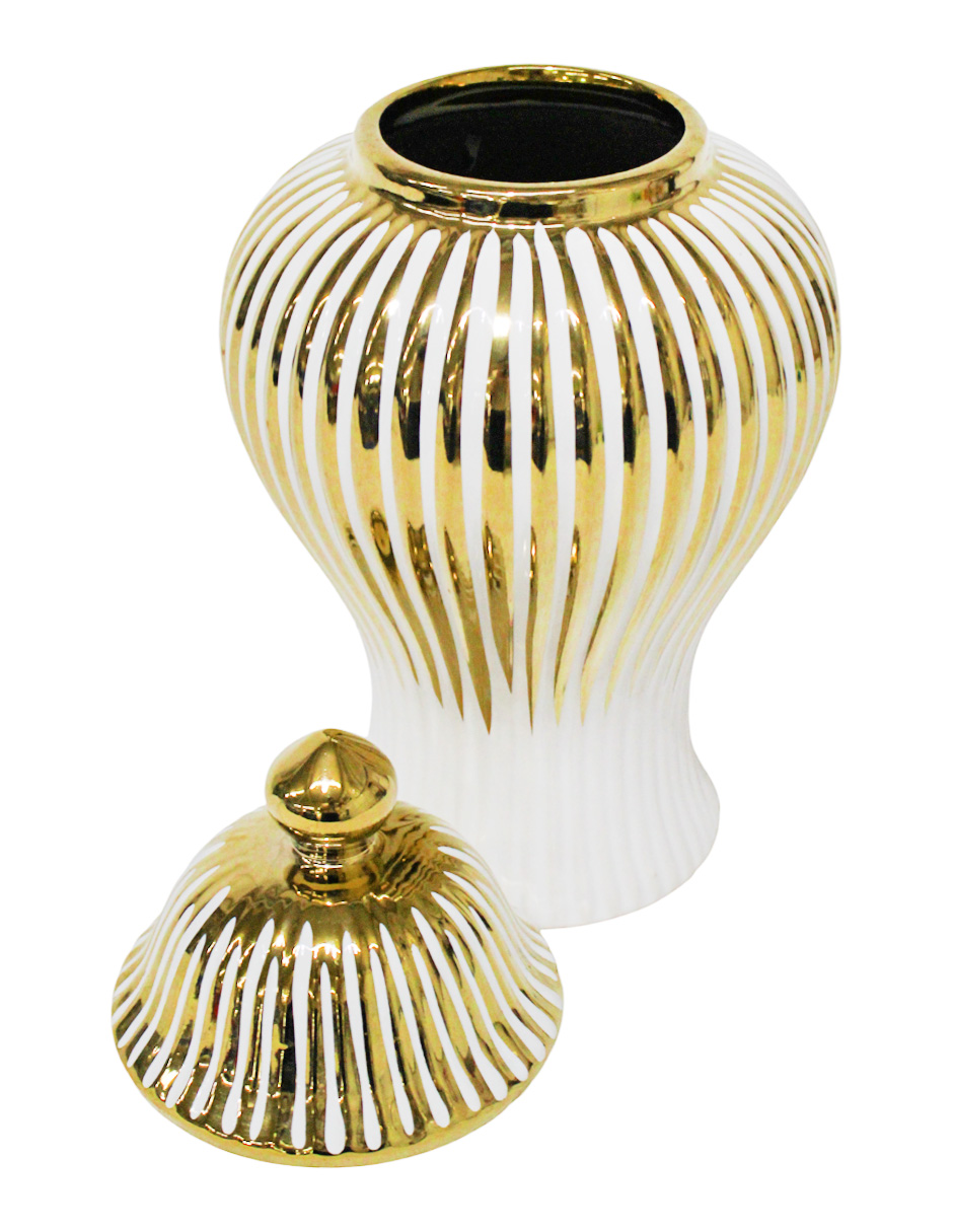 Inyecta un lujo sereno y un impacto visual sofisticado a tu espacio con este imponente tibor decorativo. Su diseño en cerámica combina la elegancia atemporal del blanco inmaculado con sutiles acentos en tono oro, creando una pieza de máxima distinción y opulencia discreta. Es el acento perfecto para infundir glamour, serenidad y un toque chic atemporal en repisas, mesas auxiliares o consolas. Material: Cerámica. Medidas: 17.5 x 17.5 x 35 cm.
