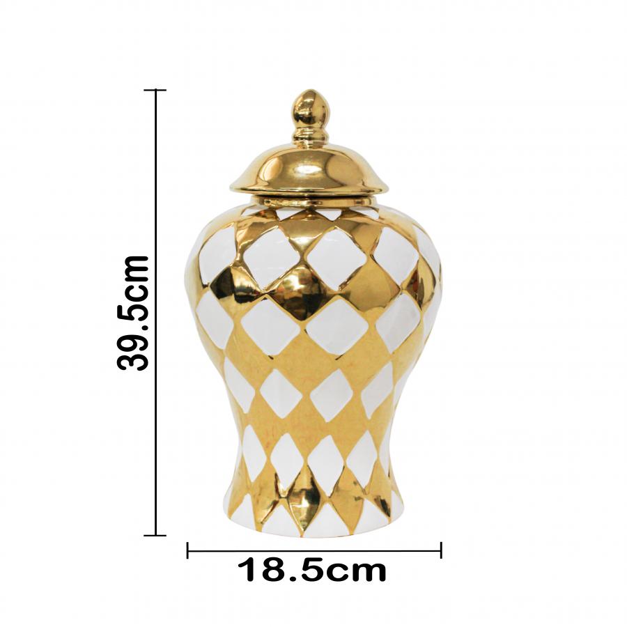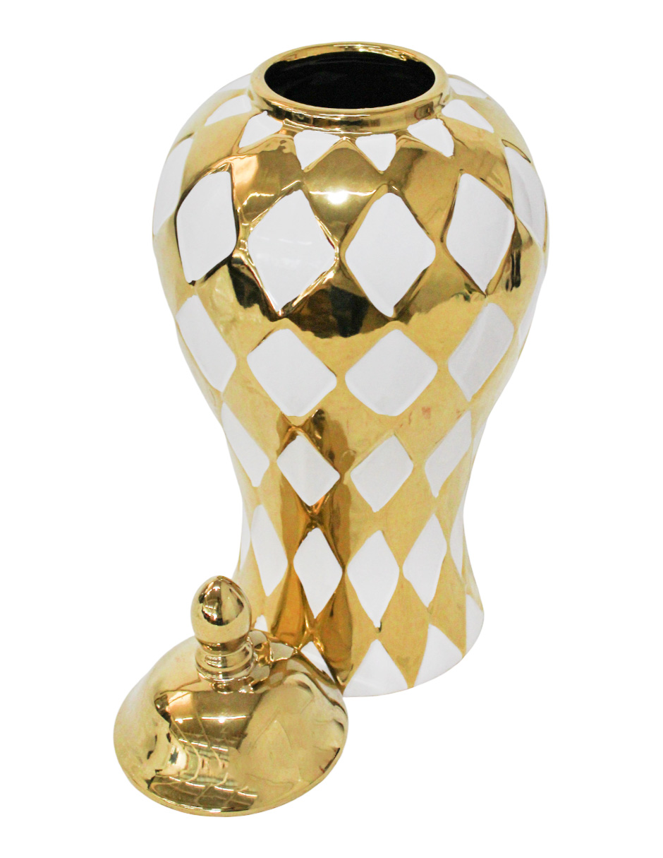 Inyecta un lujo clásico y un impacto visual audaz a tu espacio con este imponente tibor decorativo. Su diseño en cerámica con un patrón de ajedrez en sofisticados tonos blanco y oro crea una pieza de máxima distinción y opulencia, evocando el glamour atemporal. Es el acento perfecto para infundir elegancia, personalidad fuerte y un toque de realeza en repisas, mesas auxiliares o consolas. Material: Cerámica. Medidas: 19 x 19 x 40 cm.