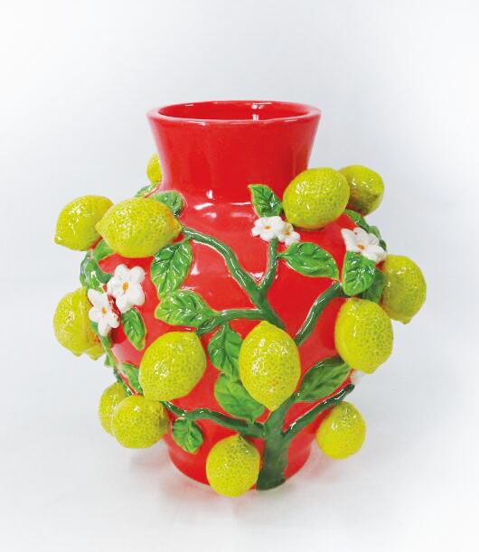 Al observar este Florero de Diseño Limonar Carmesí se experimenta una sensación de bienestar y estilo. Su acabado inmaculado y su color rojo profundo emulan la maestría de la cerámica artística contemporánea de alta gama. El diseño con texturas lineales en las hojas y limones tridimensionales no solo es una propuesta estética exitosa. También garantiza la seguridad de una pieza de alta densidad para albergar ramos de flores blancas o follaje verde con gran ligereza visual.