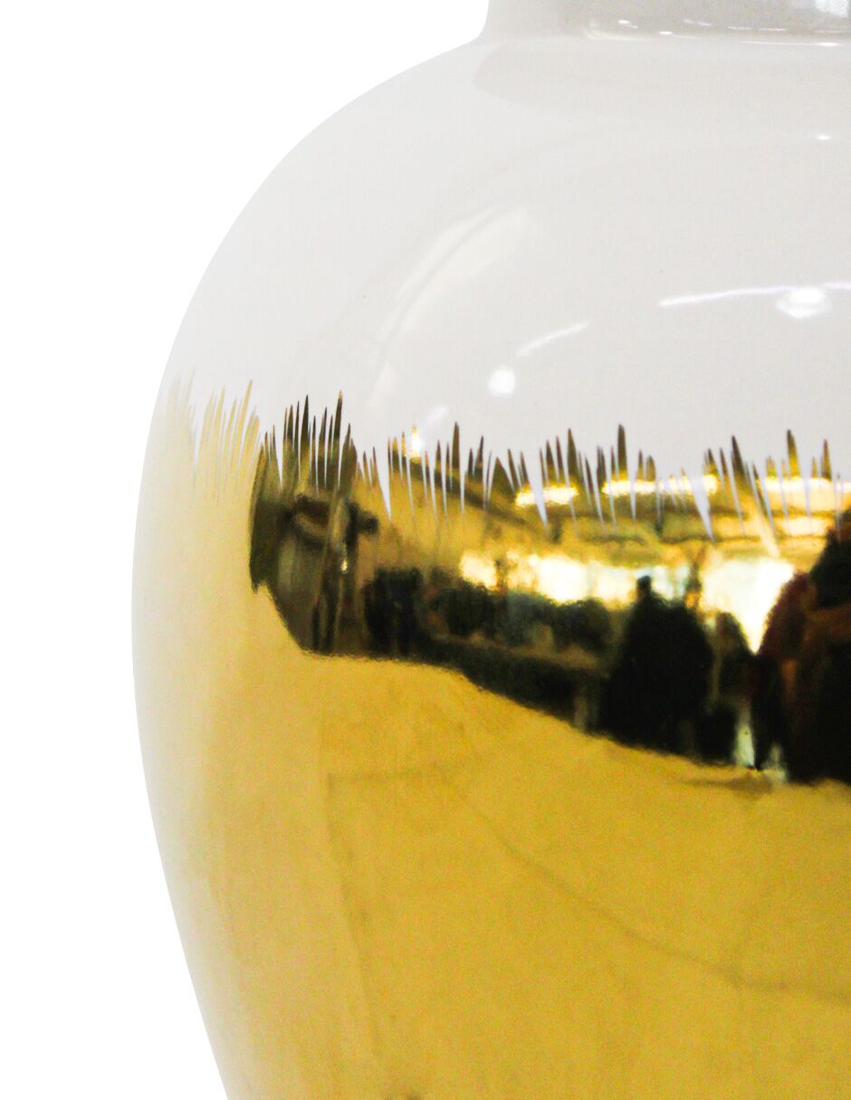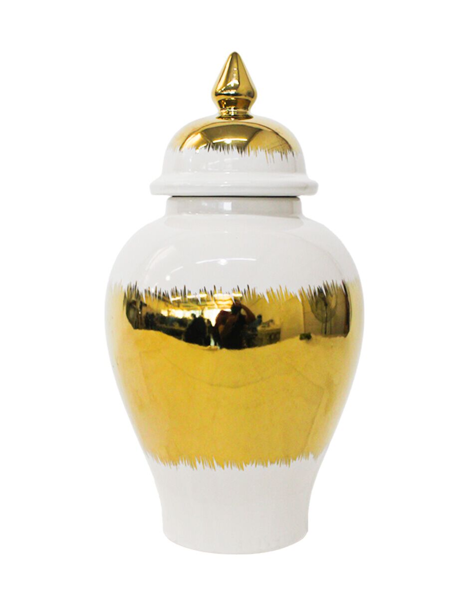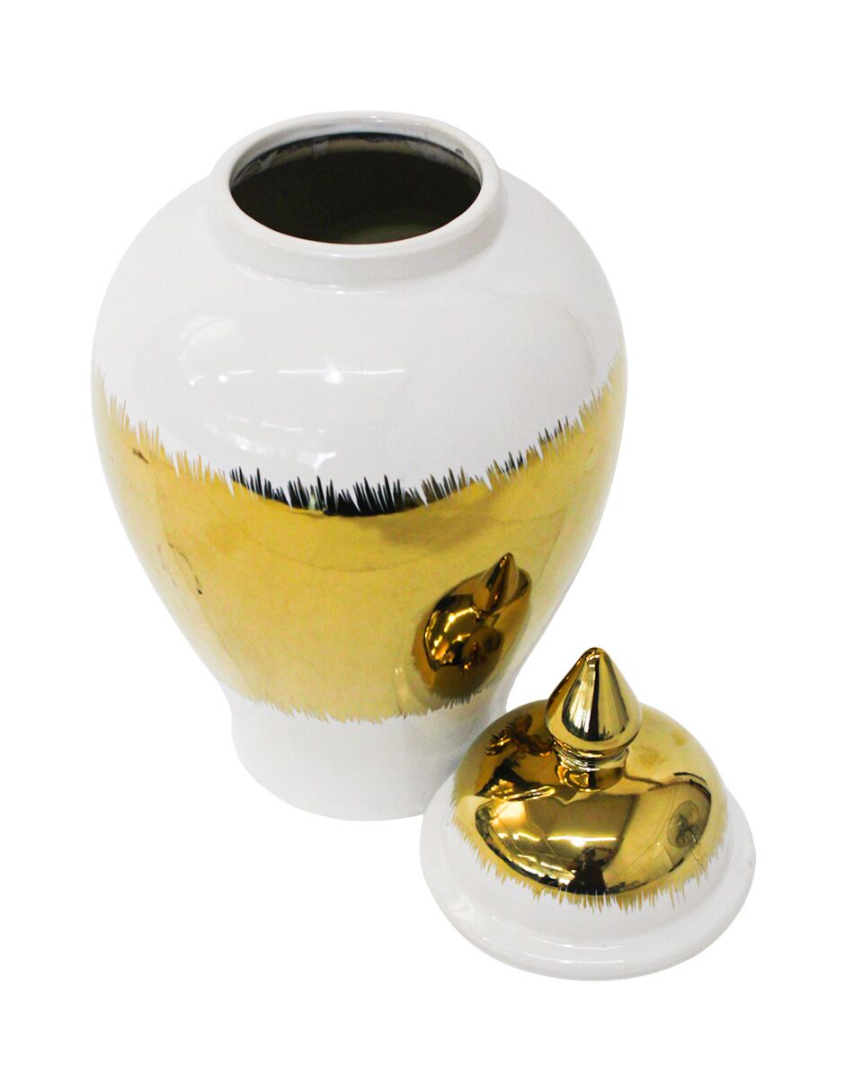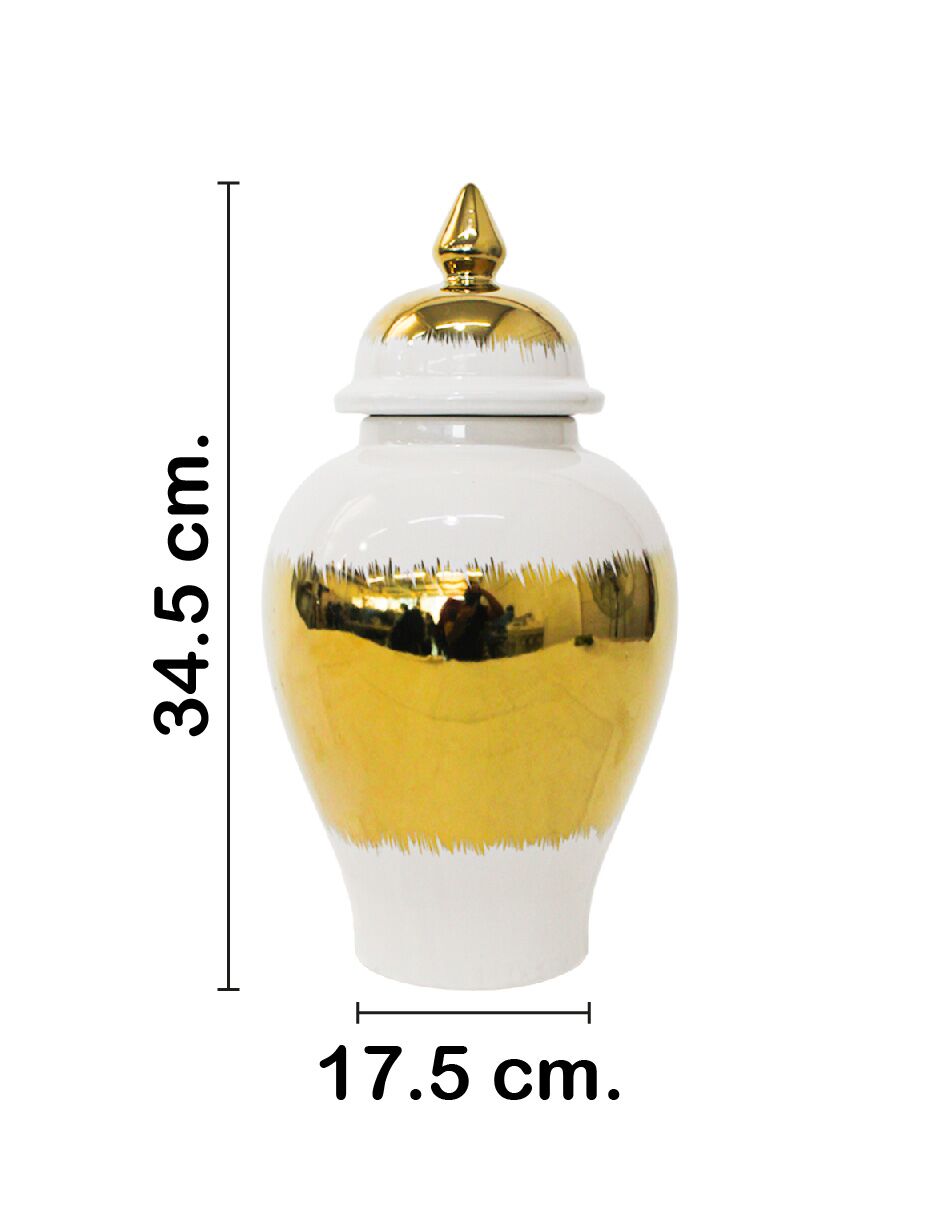 Tibor de cerámica dorado con blanco y tapa dorada de 17.5×17.5×34.5cm
