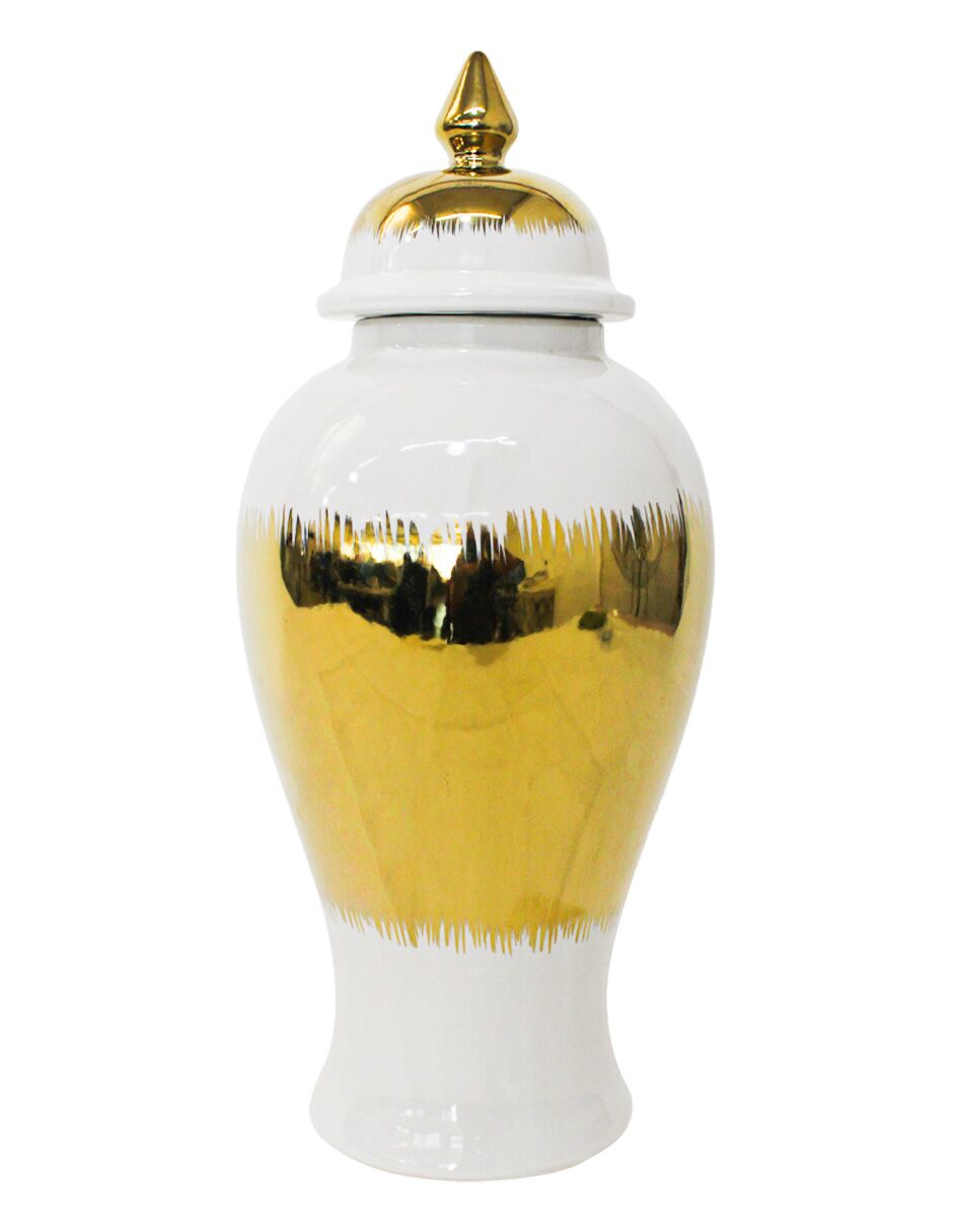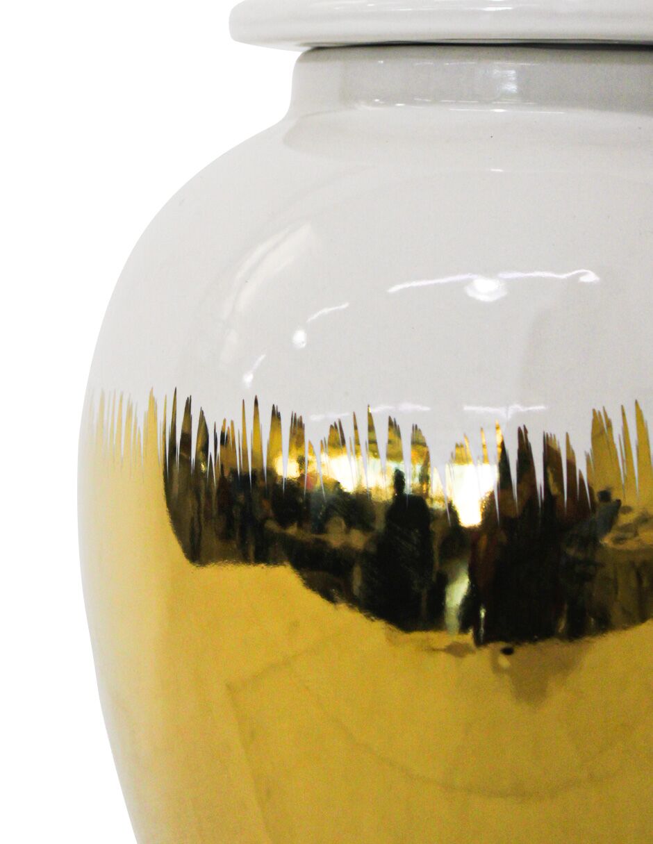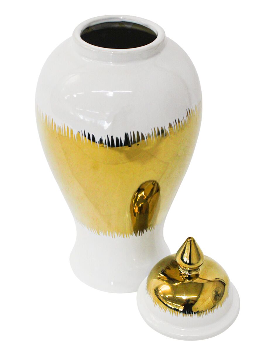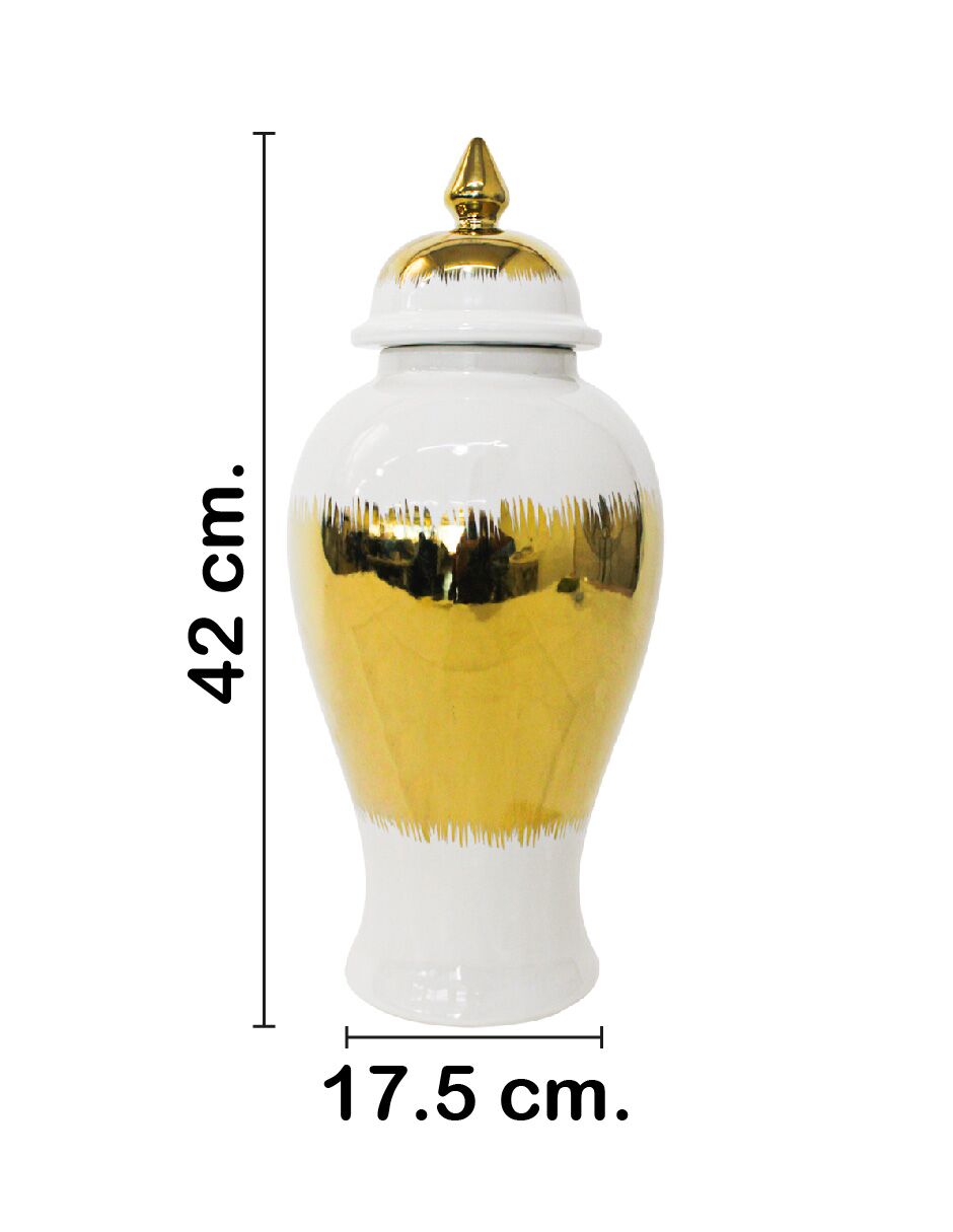 Tibor de cerámica dorado con blanco y tapa dorada de 17.5×17.5x42cm