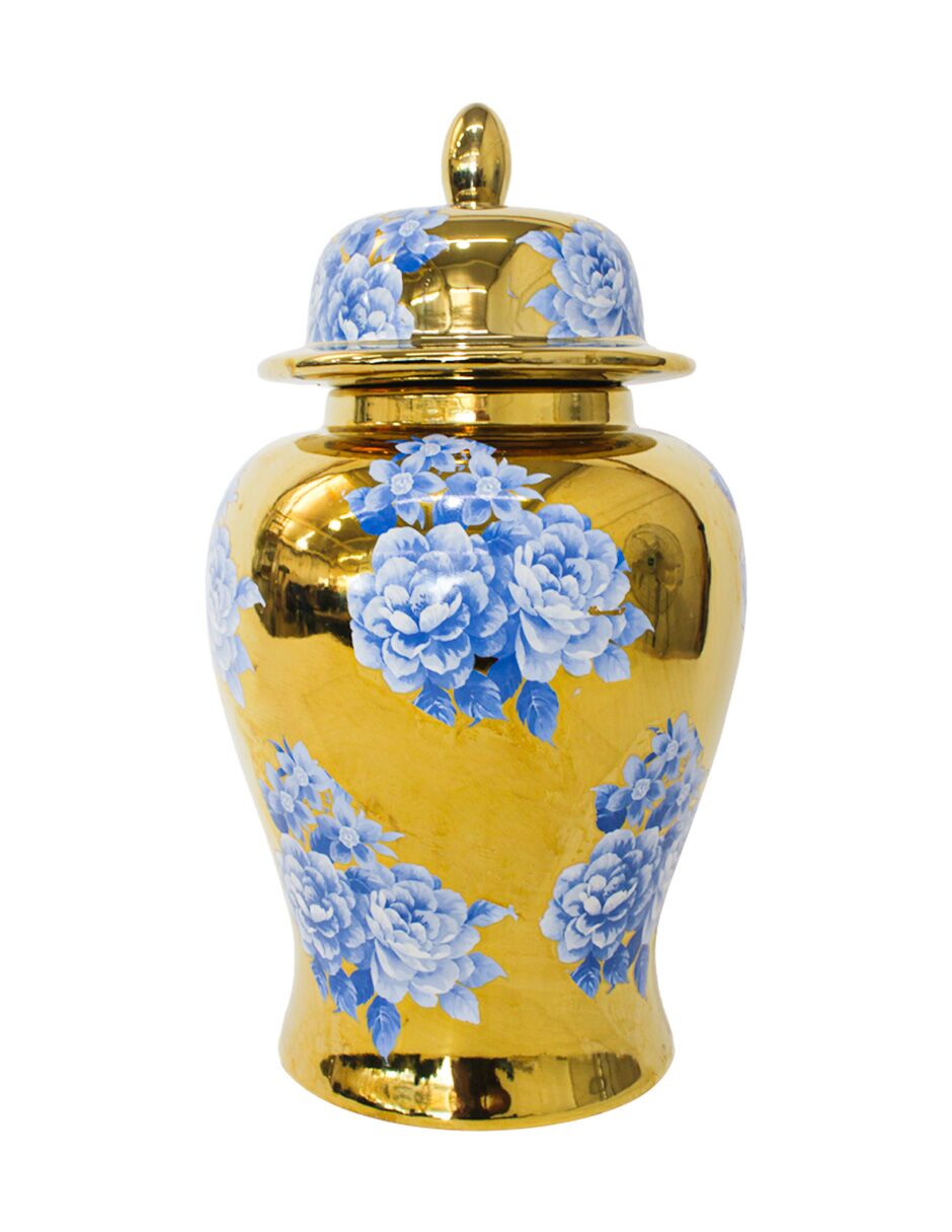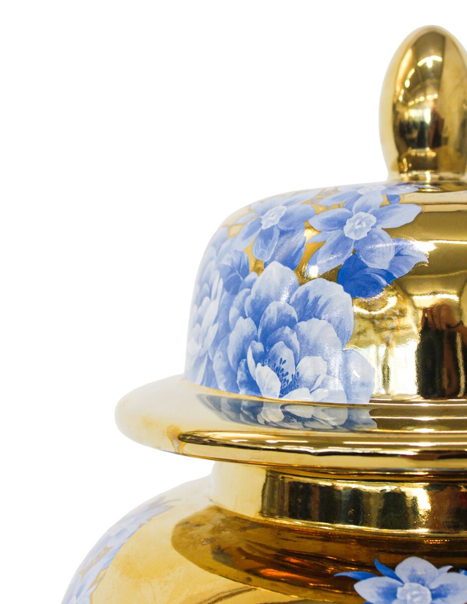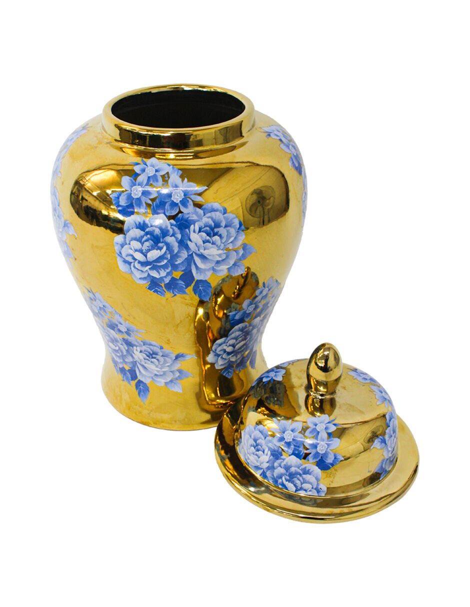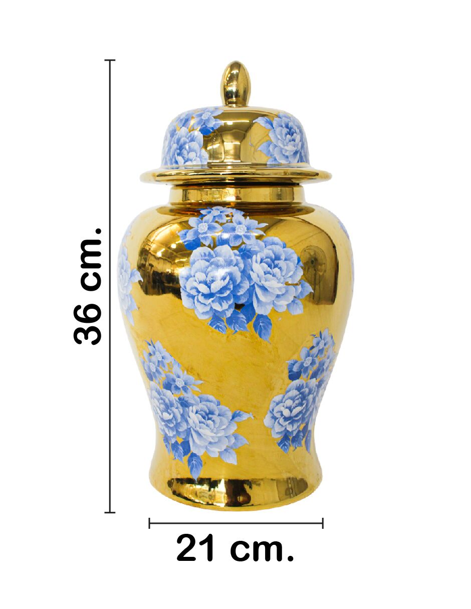 Tibor de cerámica dorado con flores azules y tapa dorada de 21x21x36cm