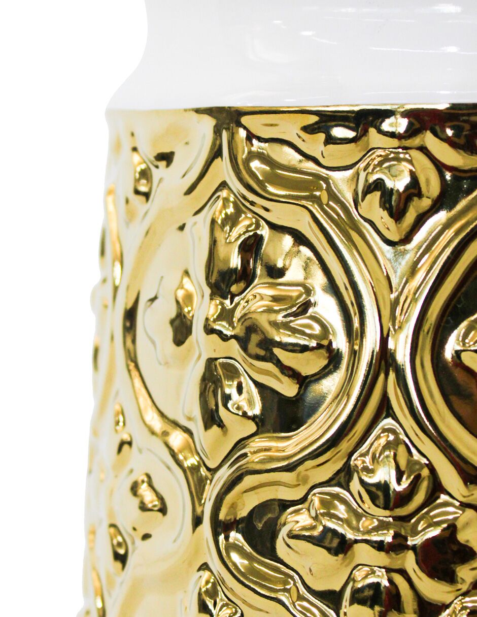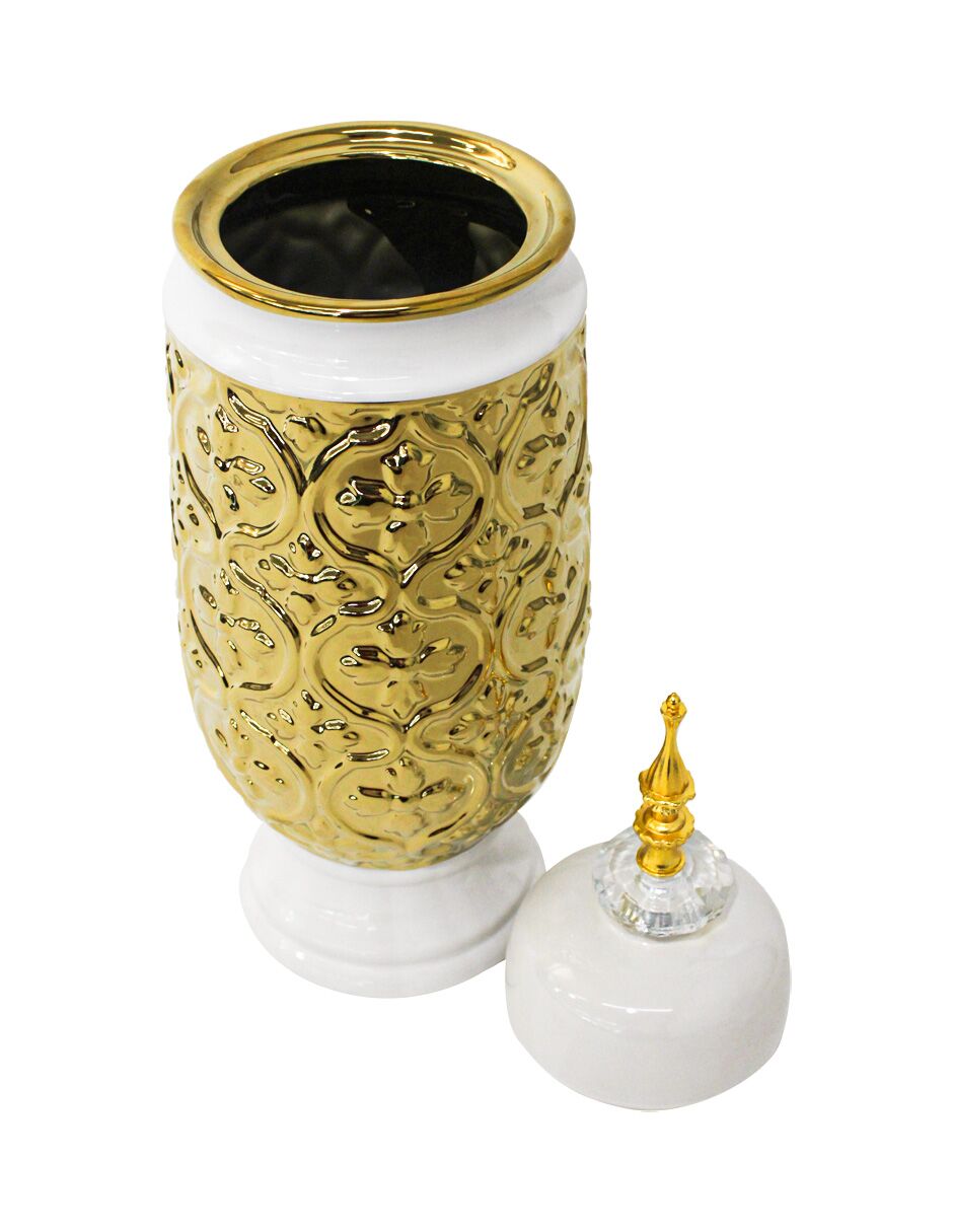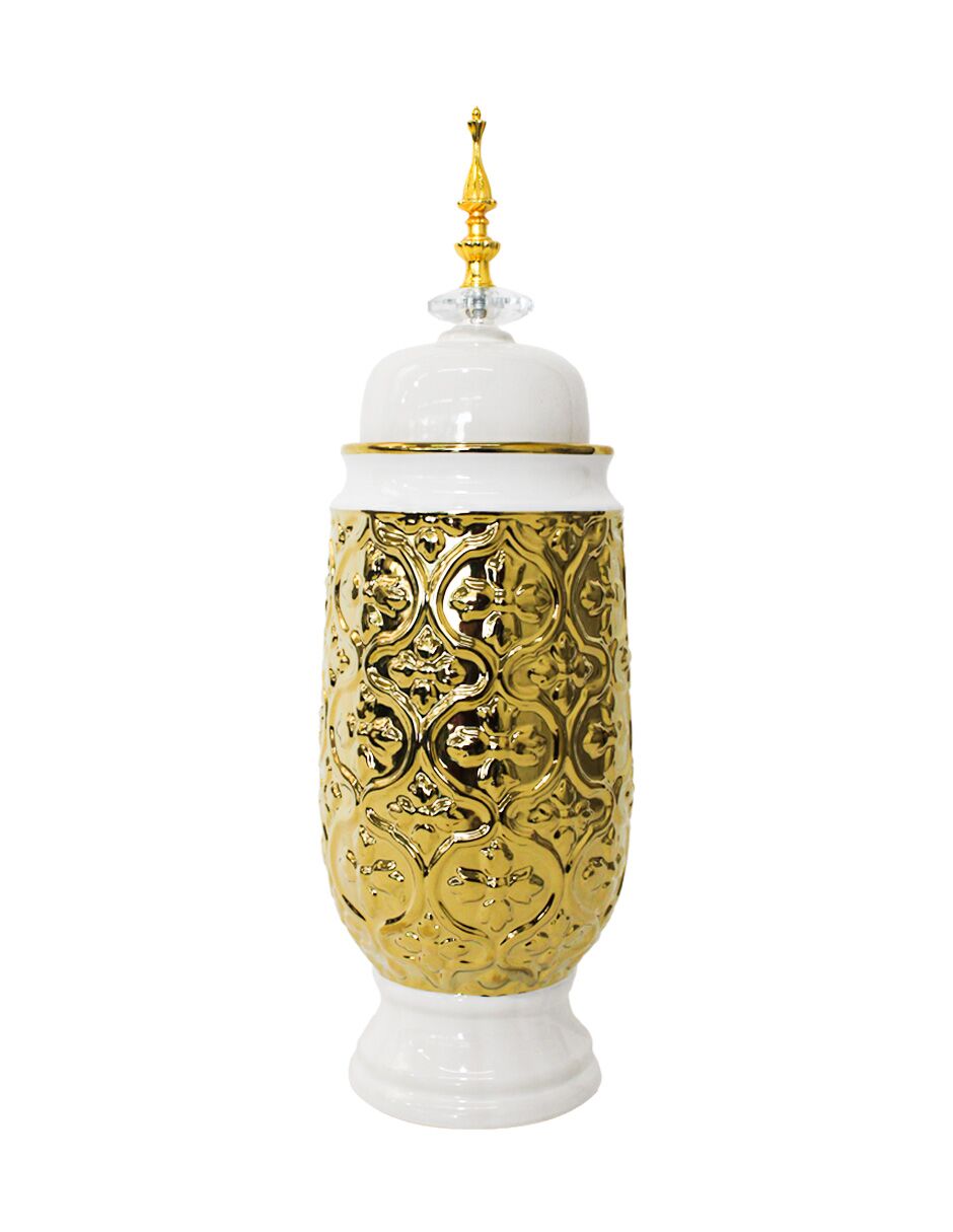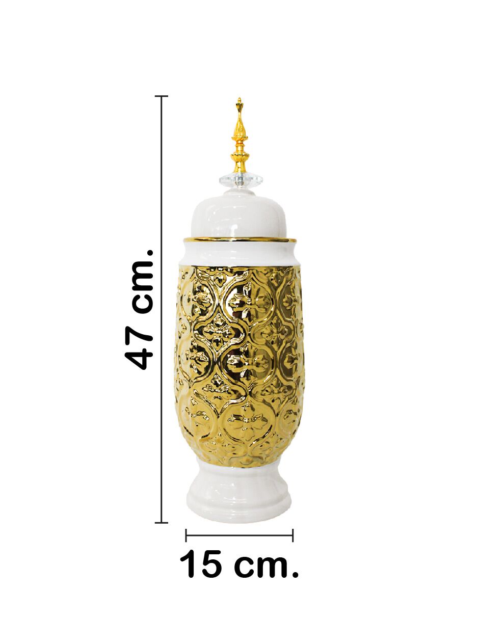 Tibor de cerámica dorado con tapa blanca de 15x15x47cm