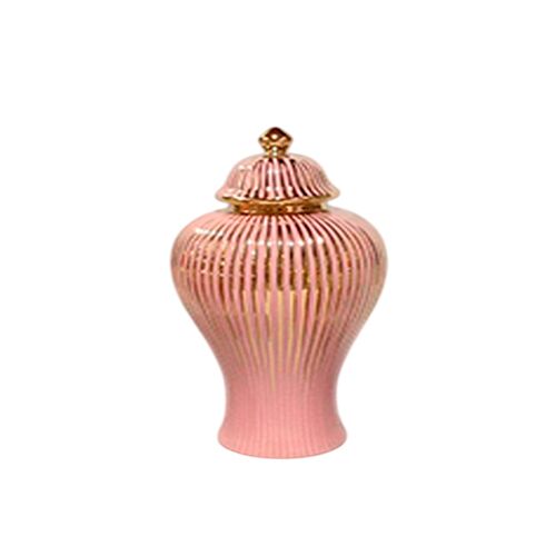 Tibor de cerámica rosa con lineas doradas de 15.5×15.5×29.5cm
