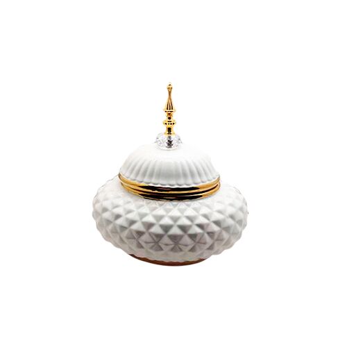 El elemento más distintivo es su superficie de cerámica, que presenta una textura facetada en relieve. Esta técnica convierte la pieza en un brillante foco de atención. El color Blanco inmaculado, combinado con los toques Dorados en la tapa y la base, crea un contraste de luz y sombra. Este Tibor Diamante Cerámica Blanco es perfecto para destacar en mesas de centro amplias o como acento en repisas bajas, gracias a su volumen horizontal.