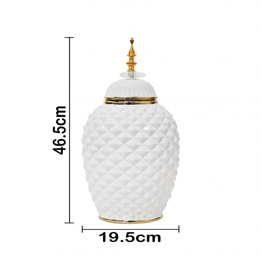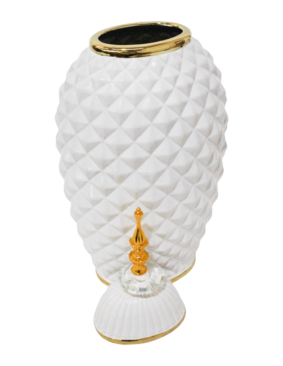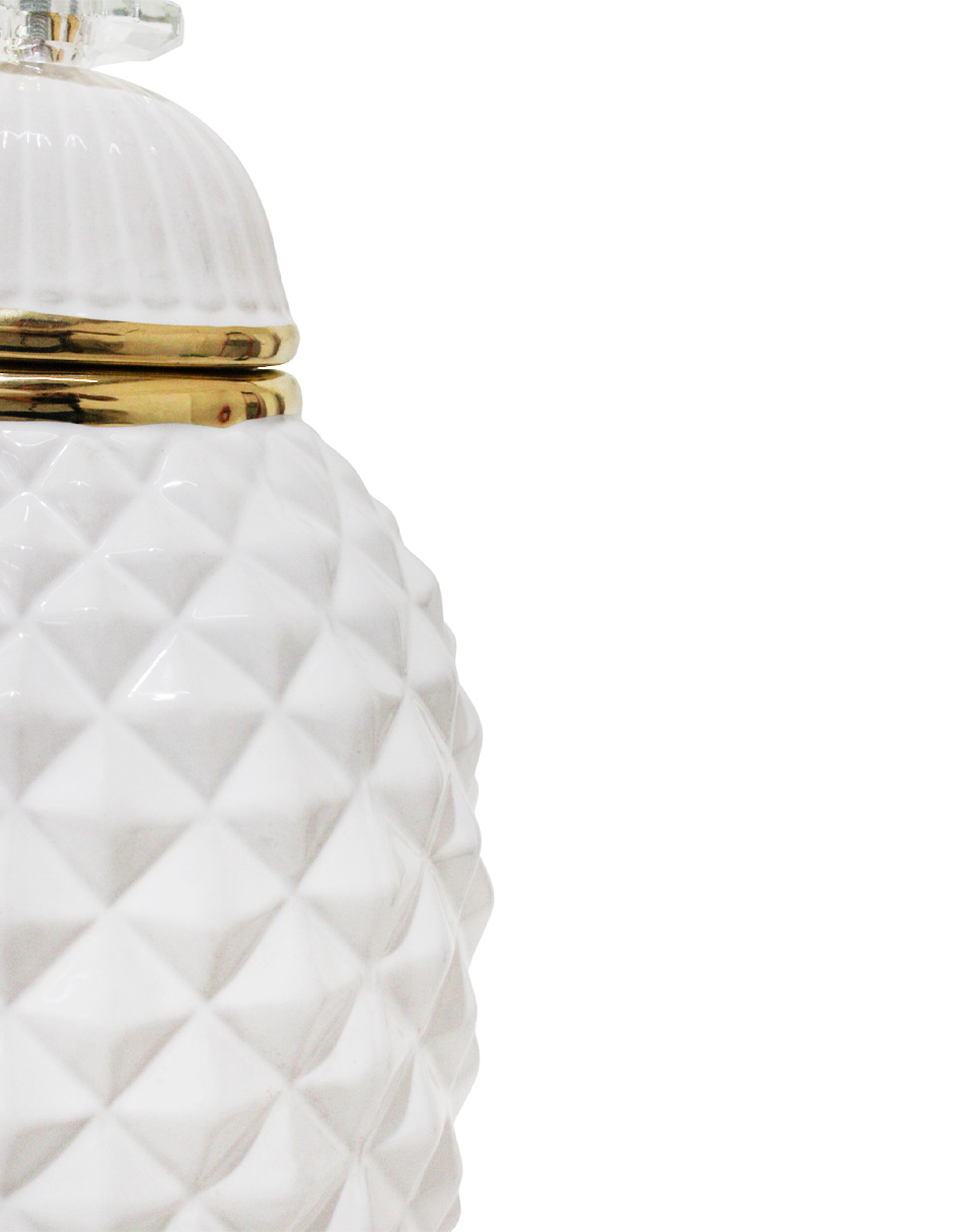 El elemento más distintivo es su superficie de cerámica, que presenta una textura facetada en relieve. Esta técnica convierte la pieza en un brillante foco de atención. El color Blanco inmaculado, combinado con los toques Dorados en la tapa y la base, crea un contraste de luz y sombra. Este Tibor Diamante Cerámica Blanco es perfecto para destacar en estanterías o mesas auxiliares.