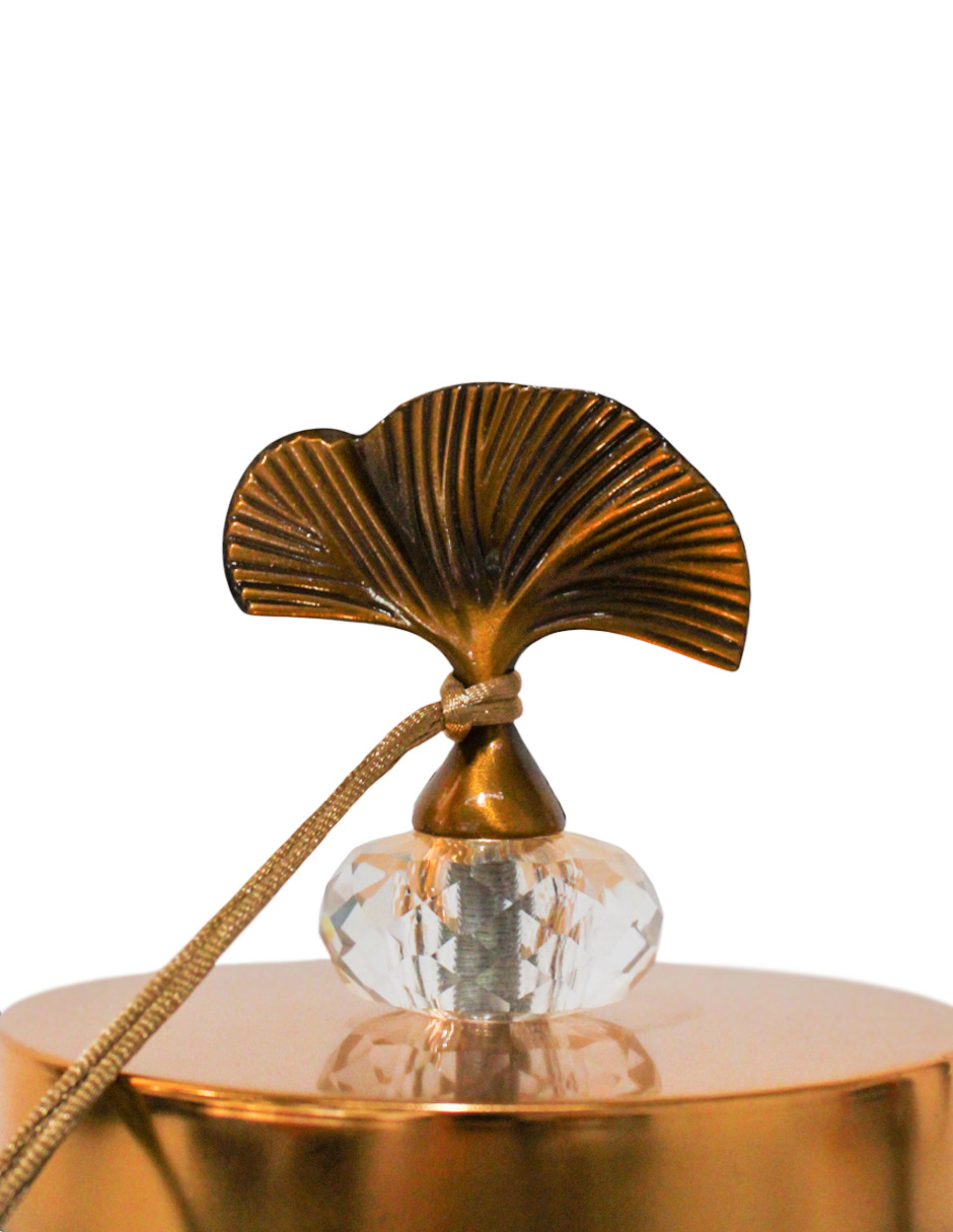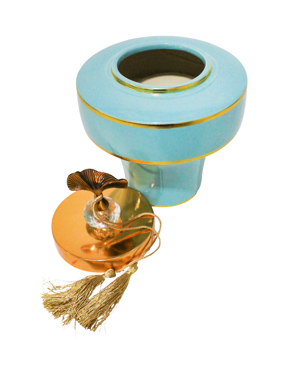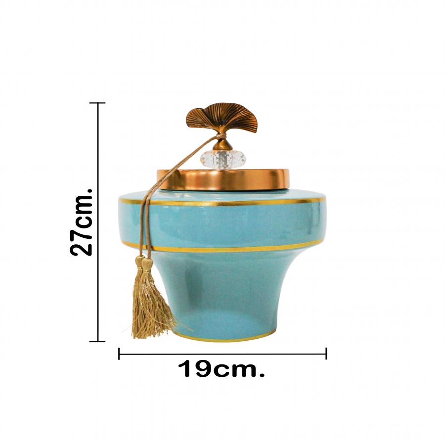 El elemento más distintivo es el remate de la tapa: una hoja de Ginko en acabado Dorado que simboliza la longevidad y la esperanza. El cuerpo de cerámica de alta calidad le confiere peso y un brillo vidriado que perdurará por años. El contraste entre el vibrante color Turquesa y el cálido Dorado crea un balance visual excepcional. Este Tibor Ginko Turquesa Dorado es perfecto para mesas auxiliares o grandes consolas.
