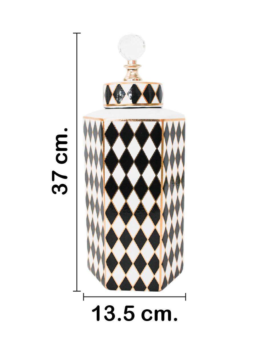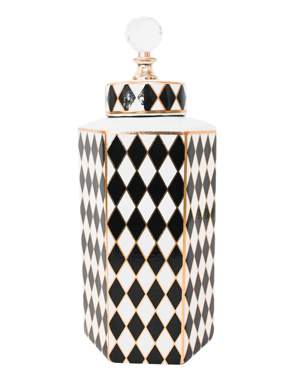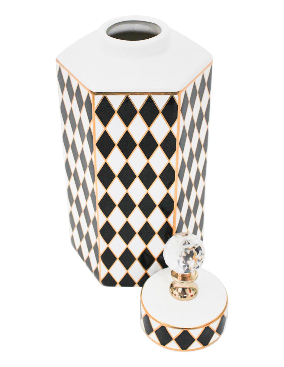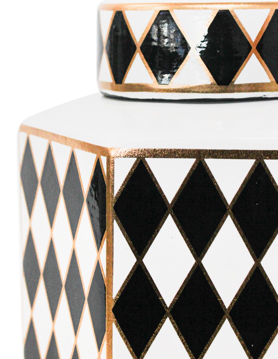 El diseño/simbolismo de esta pieza se centra en su forma distintiva Hexagonal y el patrón Arlequín en Blanco y Negro, acentuado con elegantes líneas y detalles en Dorado. Por consiguiente, su diseño simboliza la estabilidad, el lujo y una sofisticación geométrica, convirtiéndose en un punto focal de distinción y arte Art Déco.