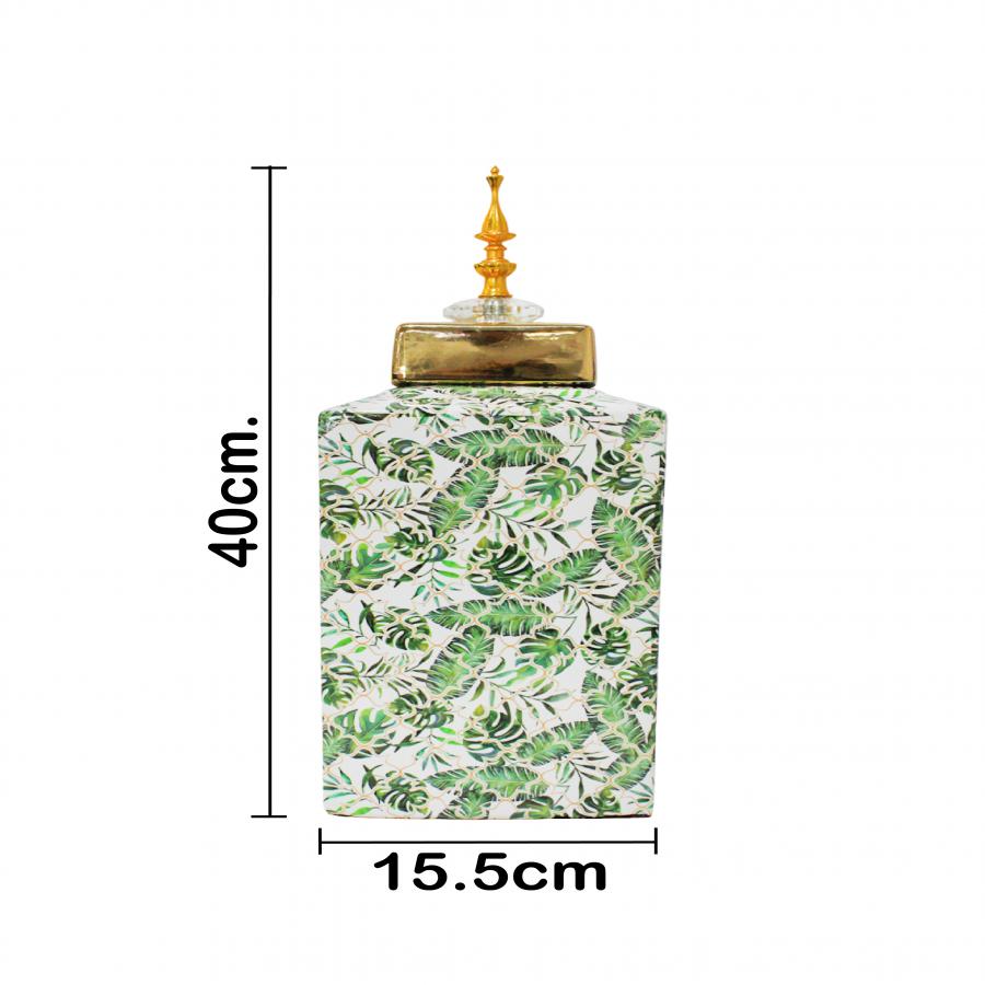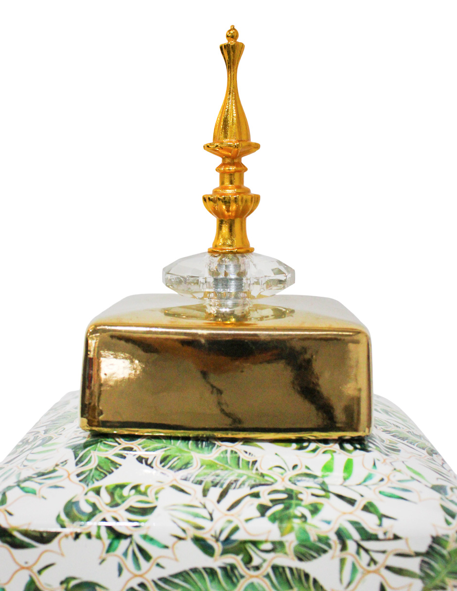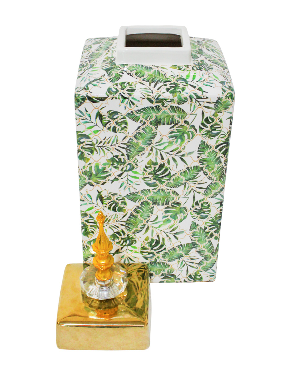 El Tibor Palmetas Tropicales es una pieza que fusiona la frescura selvática con el lujo geométrico, inyectando sofisticación en cualquier espacio. No es solo un contenedor, sino una declaración de estilo que evoca un aire exótico y audaz. Siente la vitalidad del diseño Art Decó con su forma cuadrada y patrón de hojas verdes sobre un fondo Dorado y Blanco. Su diseño rico y su silueta imponente lo convierten en un punto focal instantáneo.