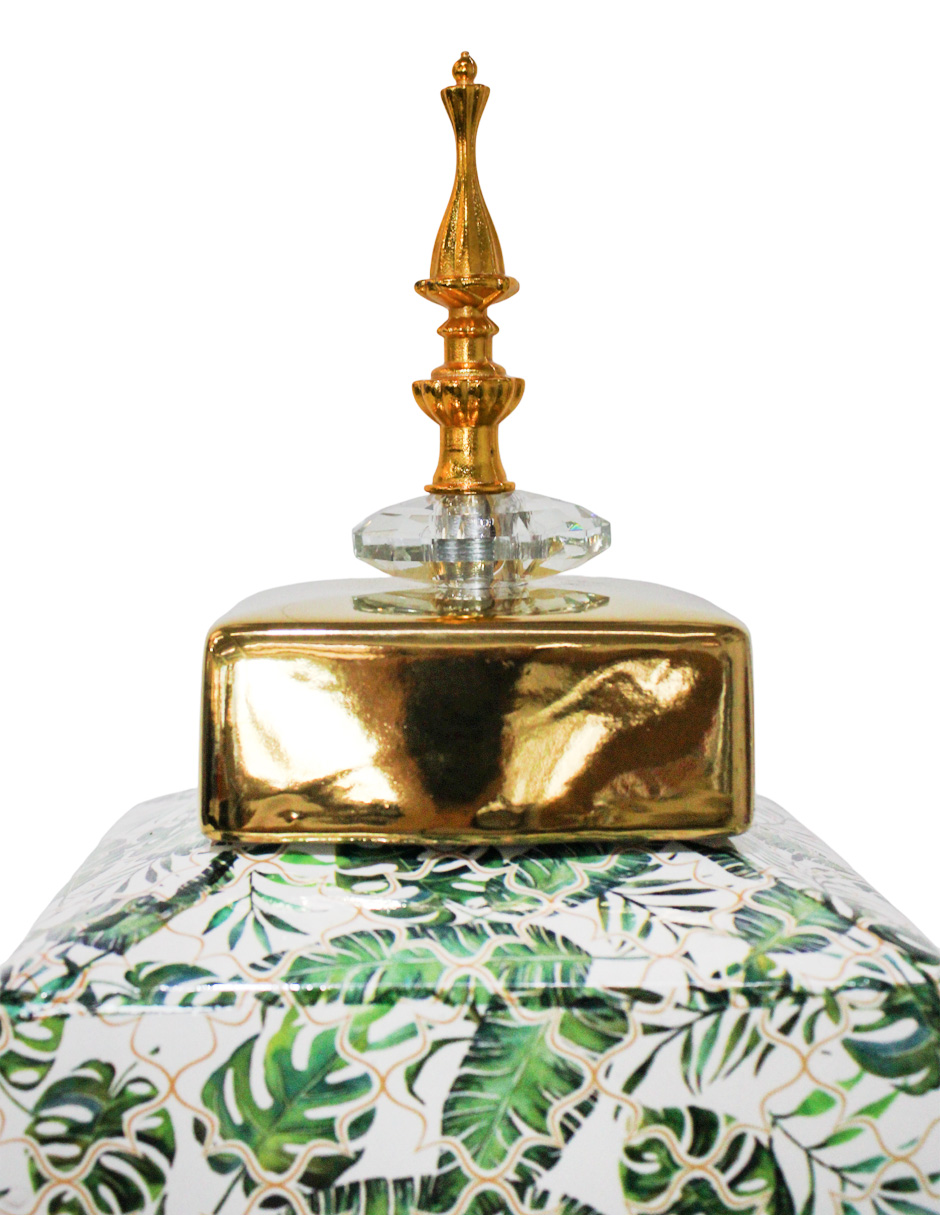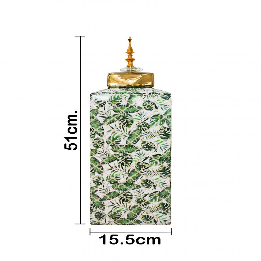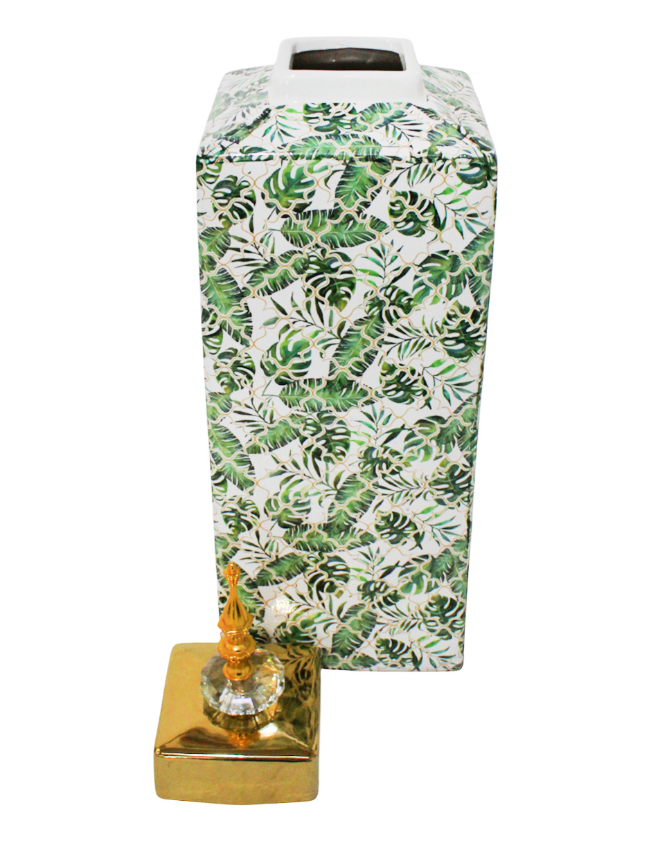 El Tibor Palmetas Tropicales es una pieza que fusiona la frescura selvática con el lujo geométrico, inyectando sofisticación en cualquier espacio. No es solo un contenedor, sino una declaración de estilo que evoca un aire exótico y audaz. Siente la vitalidad del diseño Art Decó con su forma cuadrada y patrón de hojas verdes sobre un fondo Dorado y Blanco. Su diseño rico y su imponente silueta vertical lo convierten en un punto focal instantáneo.