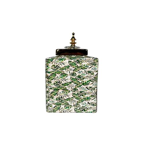 El Tibor Palmetas Tropicales es una pieza que fusiona la frescura selvática con el lujo geométrico, inyectando sofisticación en cualquier espacio. No es solo un contenedor, sino una declaración de estilo que evoca un aire exótico y audaz. Siente la vitalidad del diseño Art Decó con su forma cuadrada y patrón de hojas verdes sobre un fondo Dorado y Blanco. Su diseño rico y su silueta de tamaño medio lo convierten en un punto focal instantáneo.