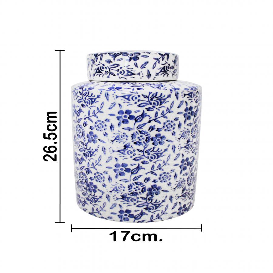 El elemento más distintivo es el patrón floral estilo Holandés, que adorna toda la superficie con detalles minuciosos en un vibrante Azul sobre fondo Blanco. Esta técnica evoca la porcelana de colección y aporta una riqueza visual inigualable. El cuerpo de Cerámica de alta calidad le confiere peso y una sensación de lujo duradero. Este Tibor Floral Holandés es ideal para estanterías, libreros o pequeñas mesas auxiliares.