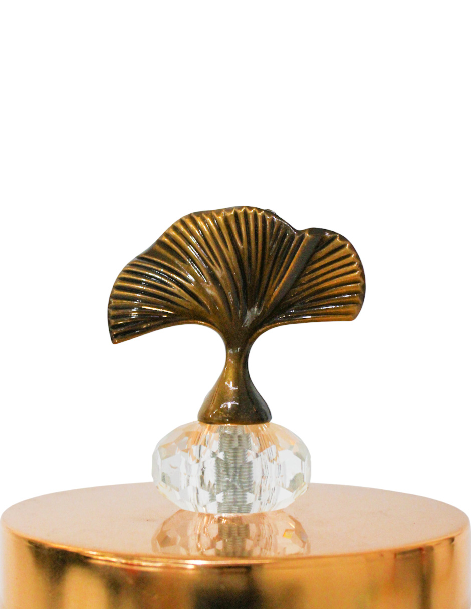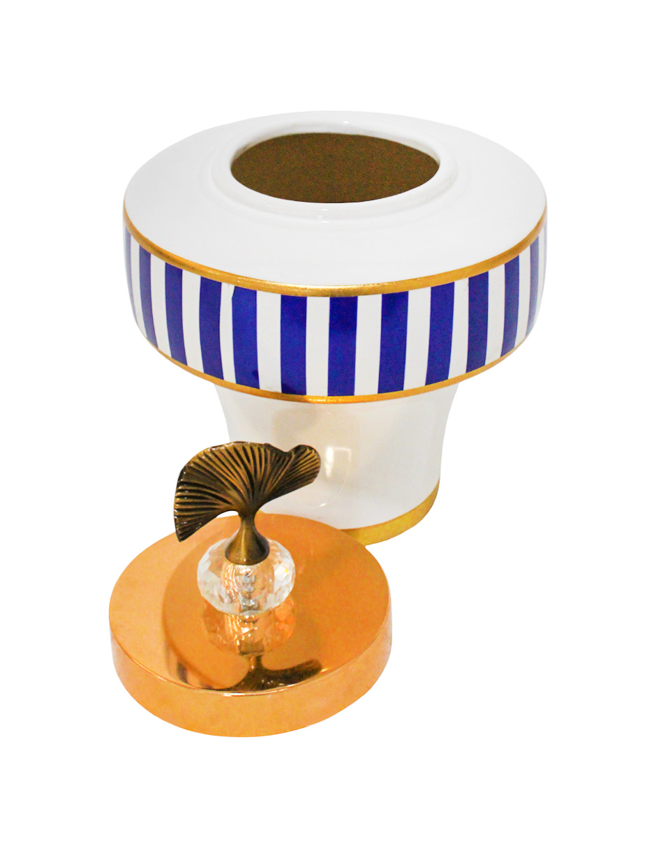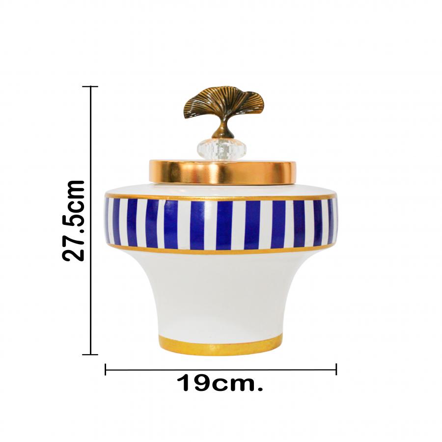 El elemento más distintivo es el remate de la tapa: una hoja de Ginko en acabado Dorado que simboliza la longevidad y la esperanza. El cuerpo de cerámica de alta calidad le confiere peso y un brillo vidriado que perdurará por años. El contraste entre el frío color Navy y el cálido Dorado crea un balance visual excepcional. Este Tibor Rayas Navy Ginko es perfecto para mesas auxiliares o grandes repisas, destacando por su volumen.