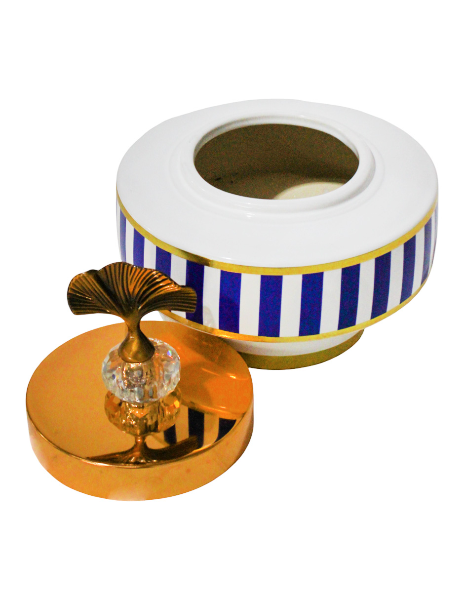 El elemento más distintivo es el remate de Ginko Dorado que corona la tapa, un símbolo de longevidad y elegancia. El cuerpo de Cerámica de alta calidad presenta un clásico patrón de rayas Navy que le confiere una textura visual de inspiración marítima y costera. Los acentos en Dorado elevan la pieza a un nivel de lujo discreto. Este Tibor Rayas Navy Ginko Dorado es ideal para estanterías o mesas auxiliares.
